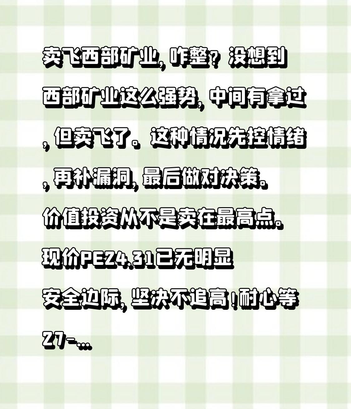 卖飞西部矿业,咋整? 没想到西部矿业这么强势,中间有拿过,但卖飞了。这种情况先控情绪,再补漏洞,最后做对决策。价值投资从不是卖在最高点。 现价PE24.31已无明显安全边际,坚决不追高!耐心等27-29元区间回撤,分3批低吸,保留上涨容错率。 更关键的是升级交易体系:卖出分3批,按盈利30%、50%和破10日线量化执行,用纪律杜绝“卖飞”遗憾。