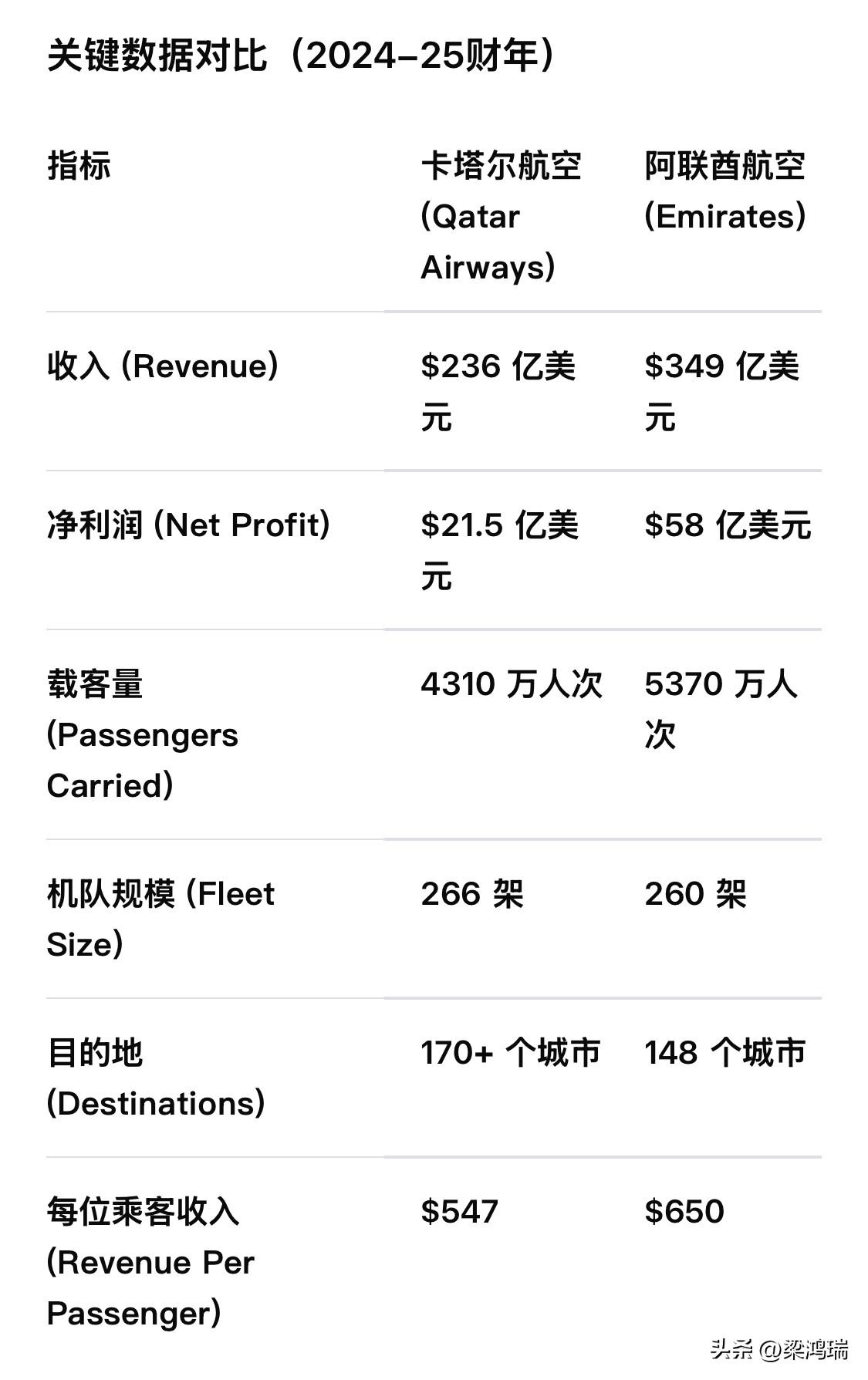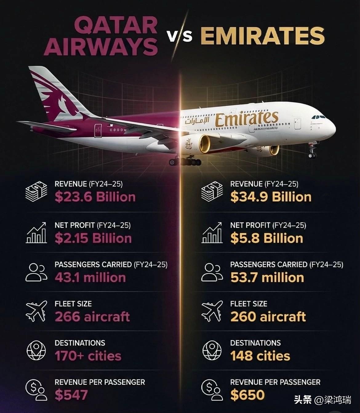 在2024-25财年的财务和运营指标方面,阿联酋航空在业绩上完胜卡塔尔航空……营收349亿美元对236亿美元,利润58亿美元对21.5亿美元,乘客数量更多,人均消费也更高(650美元)。卡塔尔航空只能无奈地回应:“可是我飞机更多,航线覆盖的城市也更多啊!” 阿联酋航空在收入、净利润、载客量和每位乘客收入方面均高于卡塔尔航空,而卡塔尔航空则拥有略大的机队规模和更多的目的地城市。 如果钱不是问题,你会选择哪条路?还是说我们都只是经济拮据?