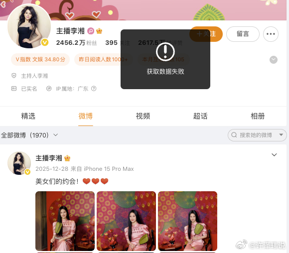 李湘全平台账号被禁止关注 李湘账号在微博、抖音、小红书平台被禁止关注