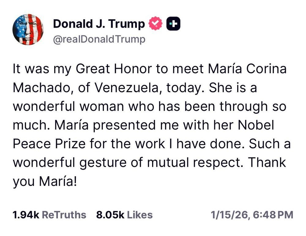 马查多把诺贝尔和平奖颁给特朗普赠人诺奖,手有余香