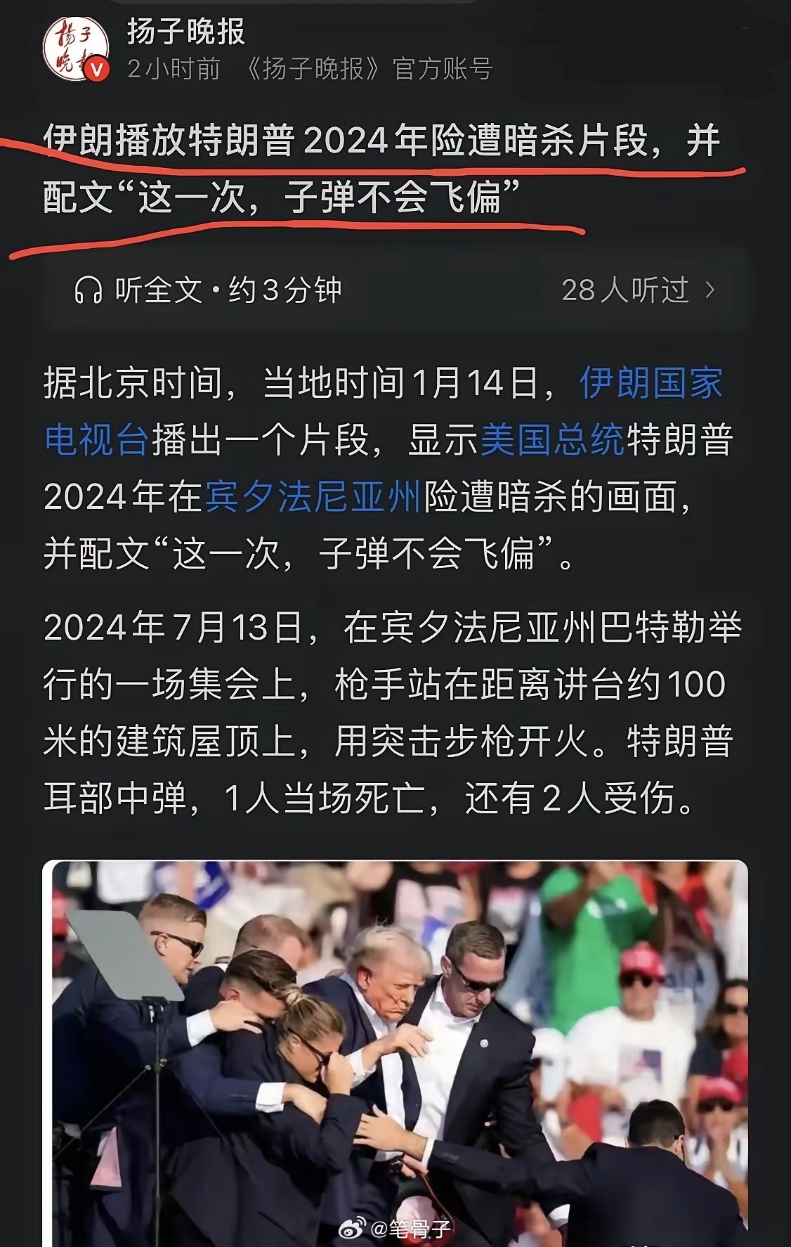 伊朗要刺杀特朗普!老特立马变怂!国家电视台播出了特朗普竞选时遭暗杀的画面,还附上声明称:“这次子弹必定不会落空。”伊朗开始和美国硬刚了,真佩服这样的勇气!就应该这样,俗话说,软的怕硬的,硬的怕不要命的。今年确实听闻到一些预言,就不知道准不准了。不管准不准,反正特朗普看到这些消息一定会怕得要死,这不,现在立马怂了,特朗普暂缓决定是否打击伊朗专栏 · 中美博弈|俄美博弈|中俄联手|寰球动态