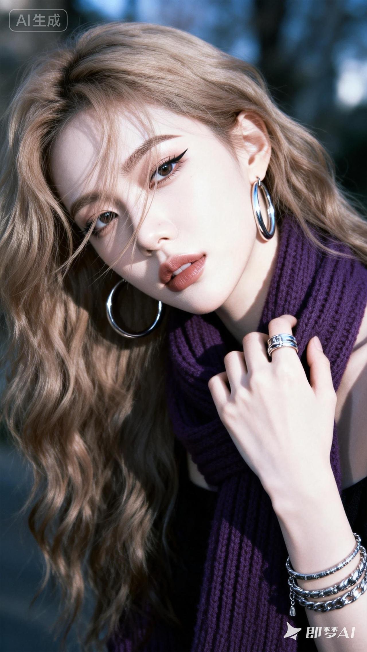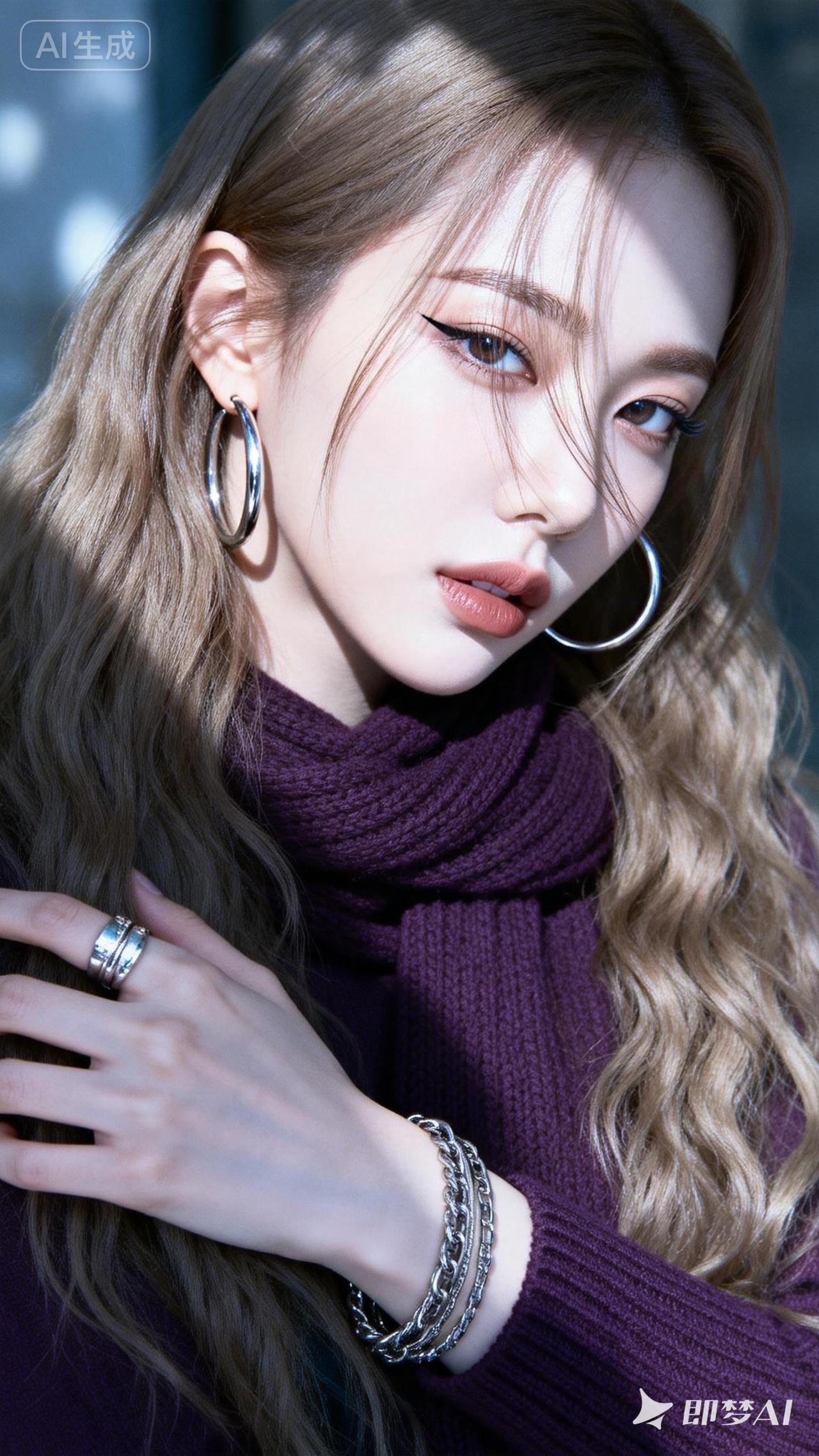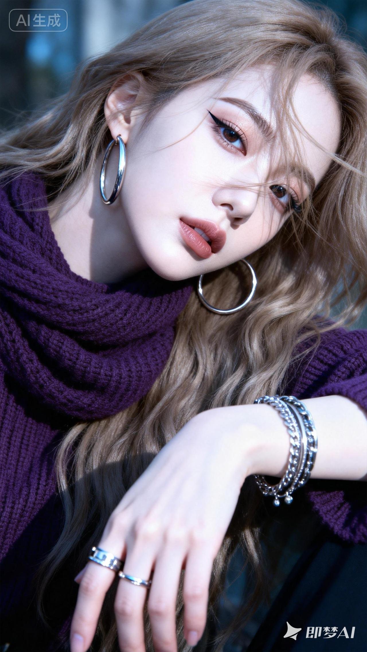 冬日暖阳下的优雅穿搭,紫色毛衣与金属耳环的完美搭配,尽显时尚魅力!🌞👗💎