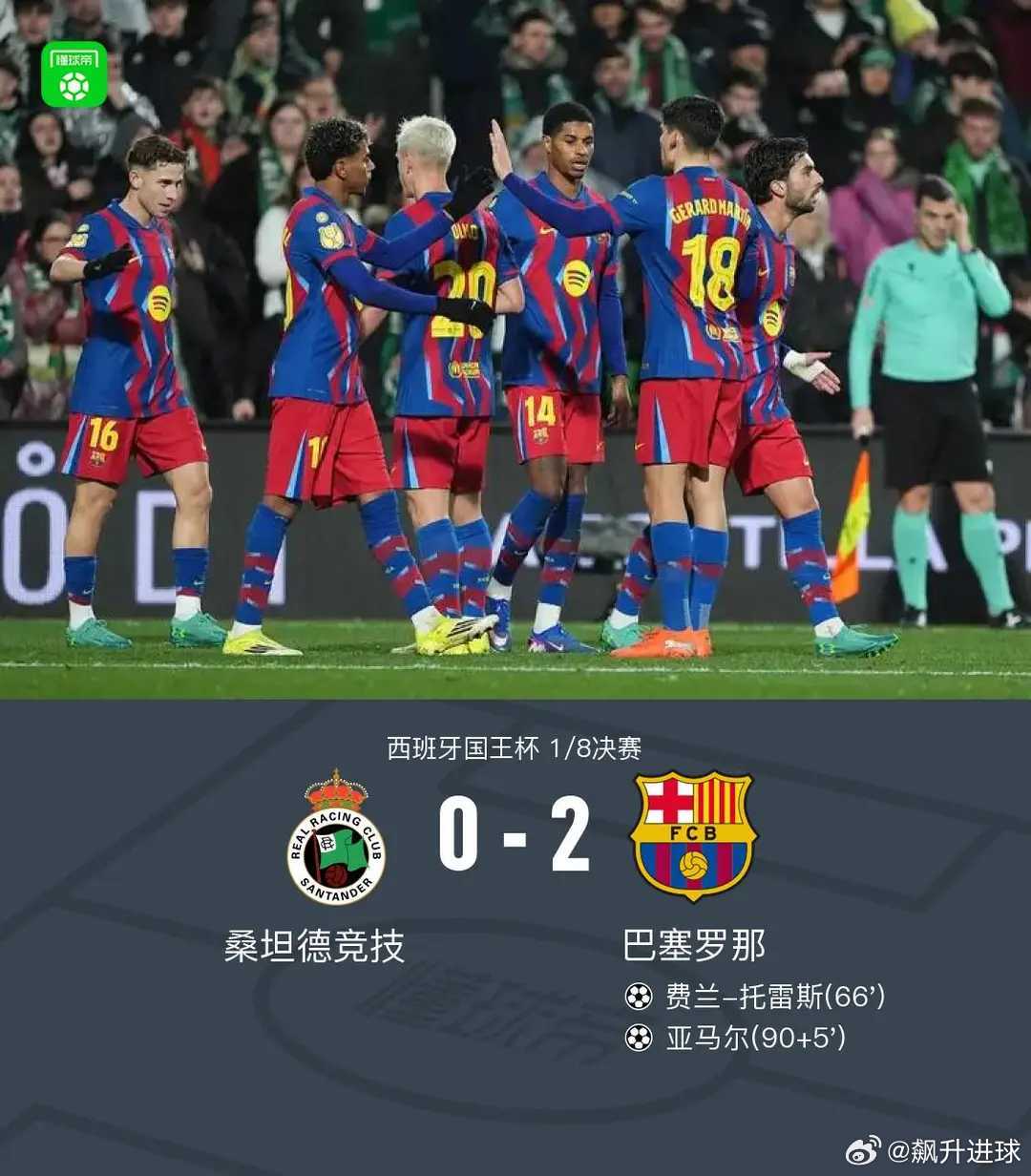 巴萨2-0桑坦德竞技,费兰-托雷斯建功,亚马尔破门北京时间1月16日,西班牙国王杯1/8决赛展开较量,桑坦德竞技迎战巴塞罗那。上半场贝尔纳尔、亚马尔造险,下半场费兰-托雷斯单刀破门,桑坦德竞技两次破门被吹,亚马尔锁定胜局。最终全场比赛结束,桑坦德竞技0-2不敌巴塞罗那,后者顺利晋级下一轮。关键事件第66分钟,费兰-托雷斯单刀晃过门将推射空门破门,巴萨1-0桑坦德竞技第90+5分钟,拉菲尼亚左路传中,亚马尔推射空门破门,巴萨2-0桑坦德竞技 桑坦德竞技vs巴萨