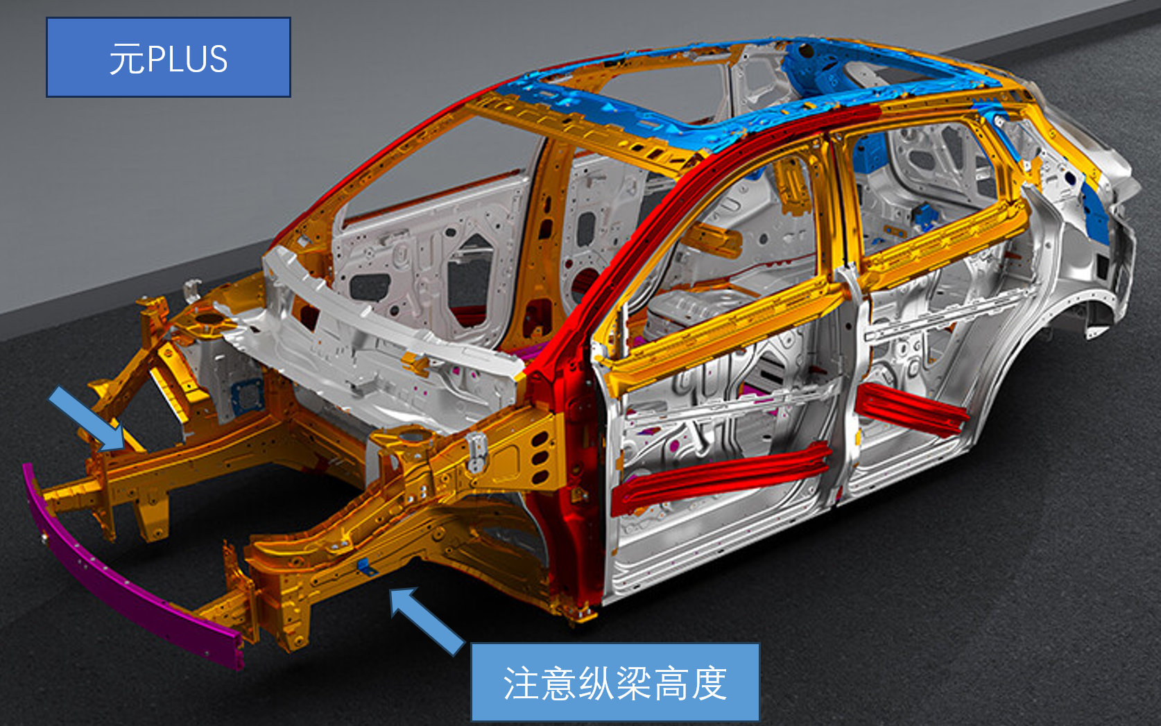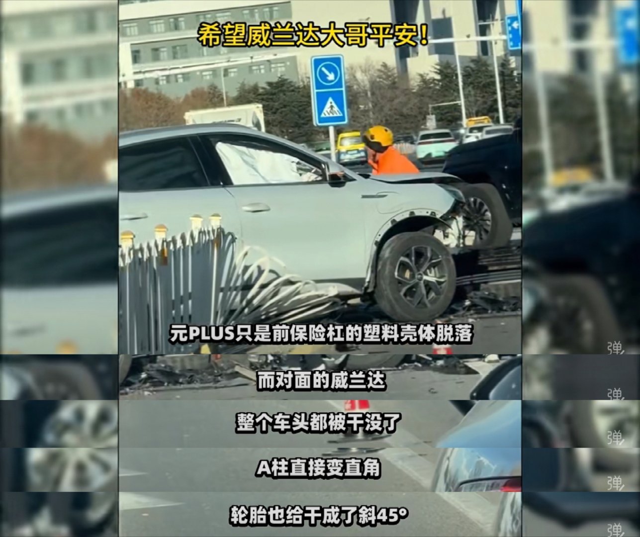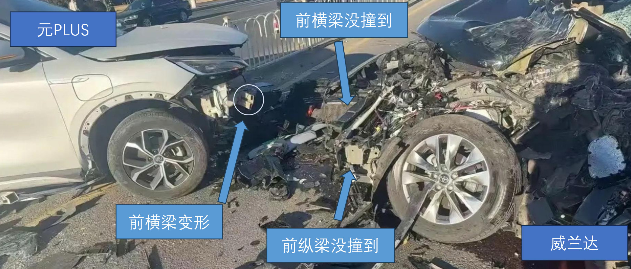 刷到了那兔视频在尬吹元PLUS的安全性,跟那瞎带节奏,忍不住吐槽一下。视频里针对元PLUS和丰田威兰达的一起对撞事故是这么说的:“元PLUS只是保险杠脱落,对面的威兰达整个车头都被干没了,A柱变直角,轮胎干成45度”“都调侃日系吸能,但也不至于被小一圈的元PLUS撞得这么惨吧?”“不知道的还以为威兰达被大泥头车撞了呢。”听听,这节奏带得飞起!光看这描述,是不是觉得元PLUS的碰撞安全性已经领先丰田几个时代了?一个“擦伤”,一个“报废”,天壤之别啊!要不是干这行的,我差点就信了。同为紧凑型SUV,安全性真能差出几个量级?咱们看事实:威兰达在2021年中保研碰撞测试里,拿的是G(优秀),包括在25%小重叠偏置以及车身结构,都是优秀评级。按常理说,威兰达的骨架也是很硬的。那为什么现场看起来威兰达输得那么惨?真相其实在“碰撞工况”里。仔细复盘视频细节你会发现:元PLUS在撞击前先跨过了护栏,车头被护栏挑起,导致实际碰撞时,它是用自己车头下半部分,去撞了威兰达车头的上半部分。大家知道,乘用车正面扛撞挑大梁的是前纵梁,而纵梁是在车头比较靠下的位置。元PLUS这波是撞了个正好,车头的吸能设计完美发挥;但威兰达就惨了,撞击点太高,横梁纵梁没接到力,只能靠上半部分A柱硬扛。这其实和钻大卡车车底的“钻底工况”有些类似,是所有乘用车的噩梦。再看现场细节就更清晰了:1. 元PLUS真的只是掉了个保险杠吗? 气囊全开,说明碰撞G值并不小,仔细看前横梁已经明显变形了。俯视图里引擎盖几乎没变形,恰恰说明受力点全在下面。2. 威兰达为什么“趴了”?原视频说的“轮胎干成45度”,正是因为载荷作用在上部,车头从上面被压垮了。而纵梁没怎么溃缩,说明力直接绕过了设计的吸能区,全卸到了A柱上。这工况,换谁都不好受。我猜肯定有人要杠:我就看结果,反正元PLUS撞赢了!我想强调的是,元PLUS安全性是可以,但你不能这么尬吹。拿一个极端有利的特殊工况去玩拉踩,这种回旋镖早晚会扎到自己身上。如果两车位置对调,结果大概率就反过来了。