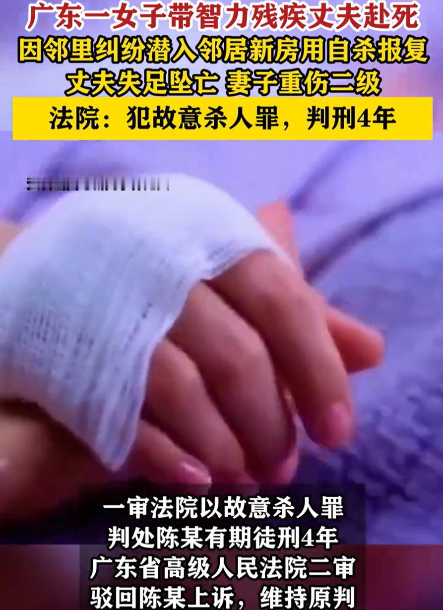 这又是何必呢!广东,女子的丈夫因出车祸导致智力残疾,一直以来,女子都不离不弃的照顾,谁知一次自己和邻居发生矛盾后,一直耿耿于怀,后来甚至竟带着丈夫跑到邻居家的新房里自杀!一死一重伤!所有人都成了输家 女子陈某原本是个再普通不过的人,有家庭,有丈夫。2018年,一场车祸把她的生活硬生生拧了个方向,丈夫黄某落下了二级智力残疾,基本丧失生活自理能力。换成谁,都会崩溃一阵子。可她没跑,也没躲,日子一天天熬着,照顾、陪着,把一个人硬生生拖着往前走 后来,她总觉得胃不舒服,检查后其实是普通的增生息肉,可不知怎么,她心里就认定了是胃癌。这个念头像藤蔓一样缠住了她,她开始整夜整夜地想:要是自己先走了,丈夫怎么办?谁能像她一样照顾他?他一个人怎么活得下去? 越想,她的心就越往下沉。最后,一个可怕的念头冒了出来:与其留他一个人在世上受苦,不如一起走了算了 人在绝望的时候,有时会把恨意当作出口。她想起和邻居长期以来的矛盾,心里那股怨气突然找到了方向,要死,也不能白白地死。她决定,带着丈夫去邻居家的新房里跳楼 期间丈夫黄某坠楼身亡,陈某亦从楼上坠下,但被救回鉴定为重伤二级。法院后来以故意杀人罪,判了她四年徒刑 事情听到这里,很多人心里会堵得慌。她可怜吗?可怜。丈夫残疾,她长期照料,心理压力大到把自己逼进了死胡同。她可恨吗?也可恨。再怎么绝望,拉着无辜的丈夫赴死,还选择在别人的房子里,把最后的恶意留给了邻居 有时候想想,照顾者不是铁人,长期的负担会悄悄掏空一个人的判断力。当一个人开始反复想着如果我不在了会怎样,这本身就是一个危险信号。比钱更重要的,是有人能接住这种情绪,能把人从封闭的念头里拉出来 我觉得,这件事给我们的提醒很沉重:一是照顾者自身的心理关怀太重要了,长期支撑别人的人,自己也需要支撑;二是人与人之间的疙瘩,若不及时化解,有时会在意想不到的地方酿成恶果;三是面对疾病,信心和科学认知才是解药,自我恐吓只会走上歧路