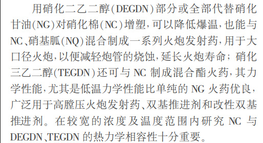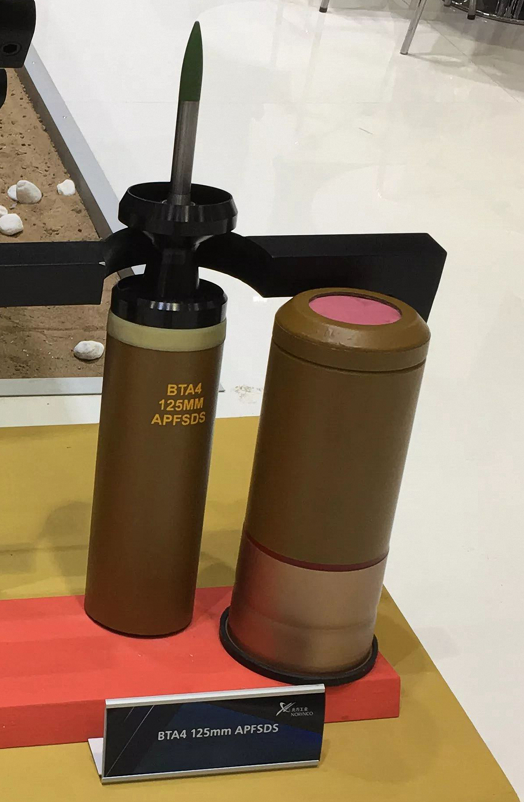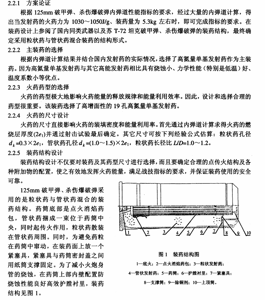 125炮的榴弹和破甲弹采用高氮量单基发射药(烧蚀小),穿甲弹采用混合硝酸酯发射药(主药筒和副药筒均是混合硝酸酯发射药),穿甲弹一期弹发射药型号ZT-2(酯太2),成分:65%硝化棉,21%硝酸甘油,11%硝化三乙二醇(太根),2.5% 2号中定剂,0.5%二氧化钛(护膛剂),二期弹DTW-125发射药型号ZT-12A,成分60%硝化棉,28%硝酸甘油,9.5%太根,2%二号中定剂,0.5%二氧化钛(护膛剂)。三期弹(DTC10-125)发射药型号ZY-11(酯乙11),主要改进是用能量更高的硝化二乙二醇(第根)取代了二期弹中的硝化三乙二醇(太根),穿甲弹动能更高,ZY-11成分:60%硝化棉,28%硝酸甘油,9.5%硝化二乙二醇,2.0%中定剂,0.5%邻苯二甲酸二丁酯。据文献报道,用硝化二乙二醇(DEGDN)部分或全部代替硝化甘油(NG)对硝化棉(NC)增塑,可以降低爆温,也能与NC、硝基胍(NQ)混合制成一系列火炮发射药,用于大口径火炮,以便减轻炮管的烧蚀,延长火炮寿命;硝化三乙二醇(TEGDN)还可与NC制成混合酯火药,其力学性能,尤其是低温力学性能比单纯的NG火药优良,广泛用于高膛压火炮发射药、双基推进剂和改性双基推进剂。DTC10-125使用酯乙型混合硝酸酯发射药是由二乙二醇二硝酸酯(DEGDN)、硝化甘油(NG)与硝化棉组成,与太根混合硝酸酯发射药相比,其能量更高。