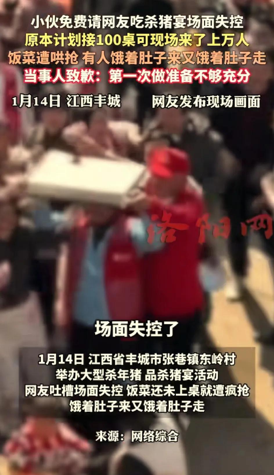 想学“呆呆”没学成 。江西丰城杀猪宴翻车现场。100桌,计划请1000个人,却来了几万人。食物到了桌上就被抢光了,有些人饿着肚子来,饿着肚子走。 场面一度失控,地上垃圾成堆,人挤人,大部分人都没吃上饭。 当事人道歉说没有准备全面。其实也不能怪他,计划请1000人,谁知道网友们那么热情,五湖四海的跑那么远来吃一场杀猪饭。大家可能都有小时候的情结吧。