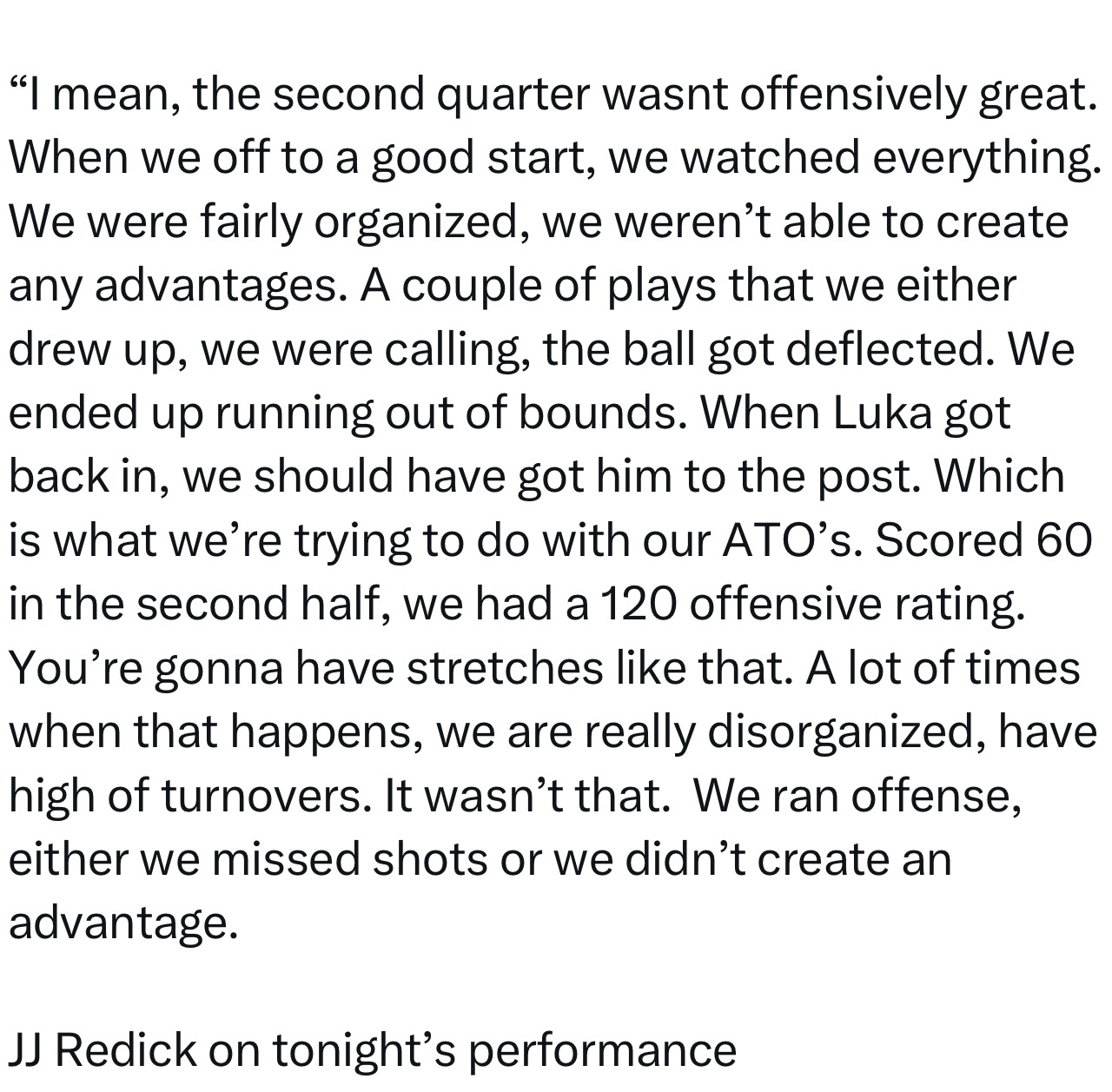 JJ·雷迪克点评湖人今晚表现:“说实话,第二节进攻端确实不理想。虽然开局打得不错,但后续我们显得过于被动观望。战术执行虽有一定条理,却没能创造出任何优势。有几次设计的战术配合——无论是画出来的还是喊出来的——球都被破坏掉,最终只能以出界收场。当卢卡重新上场时,我们本该让他去低位进攻,这本是我们暂停后战术的布置重点。下半场我们得了60分,进攻效率达到120。比赛中总会遇到这种起伏阶段,通常这种时候我们往往组织混乱、失误频发,但今晚并非如此。我们打出了战术,只是要么投丢了球,要么没能创造出机会。”黄蜂战胜湖人