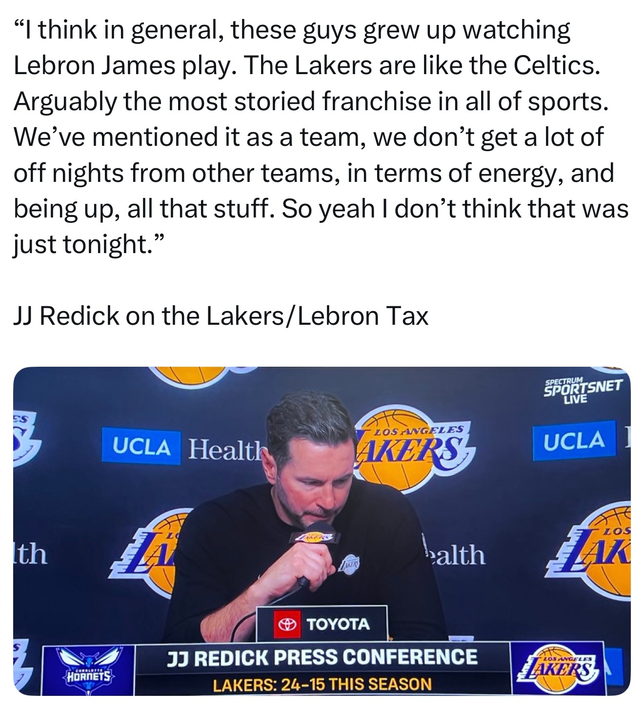 JJ·雷迪克谈到湖人/勒布朗效应时表示:“总的来说,这些球员是看着勒布朗·詹姆斯打球长大的。湖人和凯尔特人一样,可以说是体育史上最富传奇色彩的球队。我们全队都讨论过这件事——其他球队在对阵我们时,很少会放松状态,他们总是充满能量、斗志昂扬。所以没错,我认为这种情况并不仅限于今晚。”