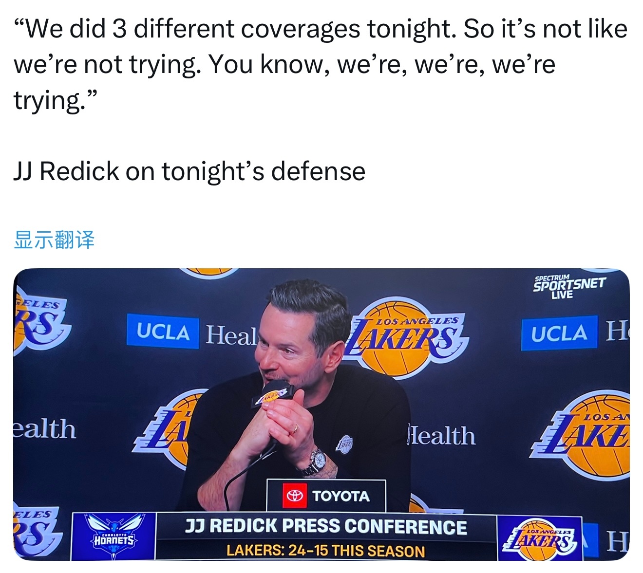 雷迪克谈今天的防守:“我们今晚尝试了三种不同的防守策略。所以并不是我们没有尽力。你知道,我们一直在努力。”