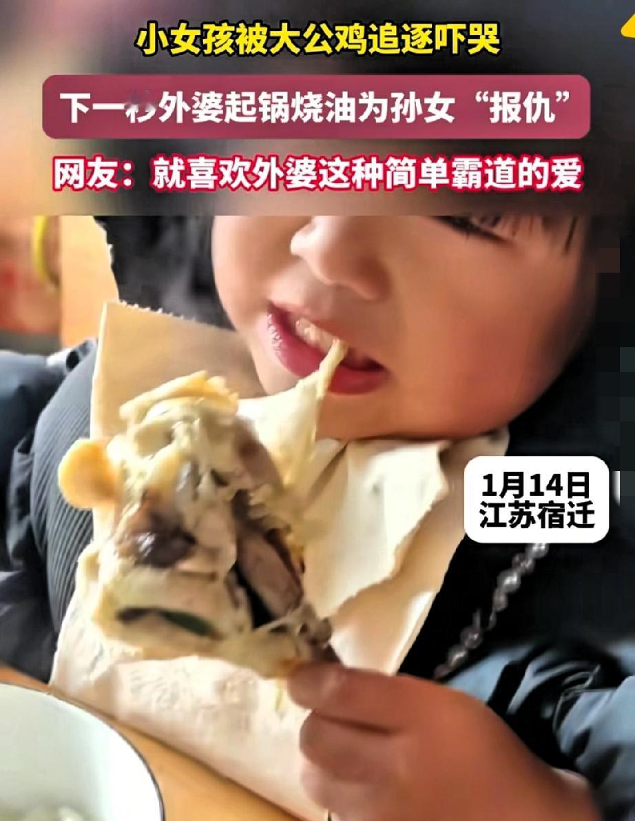 江苏宿迁这外婆也太护犊子了! 外孙女被公鸡追着啄,哭唧唧跑回屋,外婆直接上演“杀鸡儆猴”名场面,不光把肇事公鸡拿下,连围观的鸡都一锅端,炖出满满一大盆肉。 小女孩啃着大鸡腿,那叫一个香! 这哪是处理一只鸡,分明是用最硬核的方式告诉孩子:别怕,天塌下来有外婆撑着。 公鸡啄人是天性,可外婆的爱更不讲道理。 比起嘴上安慰,这种“谁欺负我的宝,就让谁没好果子吃”的行动力,才是隔辈亲最戳人的地方。 说到底,护短的长辈永远是孩子最踏实的靠山。 你家老人有没有为你做过这么霸气的事?评论区唠唠!