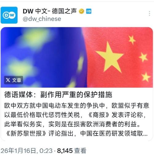 德国之声今天(1月16日)写道:“德语媒体:副作用严重的保护措施。欧中双方就中国电动车发生的争执中,欧盟似乎有意以最低价格取代惩罚性关税,《商报》发表评论称,此举看似务实,实则是在损害欧洲消费者的利益。最低价格将使价格收益直接落入中国制造商的口袋,相当于中国车企获得了欧盟的国家性价格保障,买单的则是欧盟的消费者。”   德语媒体把中欧电动车价格承诺歪曲成“损害欧洲消费者利益”,这完全是保护主义滤镜下的睁眼说瞎话。   要搞清楚事实,得先看欧盟之前的打算——之前欧盟拟加征最高35.3%的反补贴关税,这才是真的要让欧洲消费者多掏腰包。就拿一辆普通的中国电动车来说,原本因为技术和供应链优势,价格已经很有竞争力,要是加上这35.3%的关税,终端售价肯定会暴涨,消费者买一辆车可能要多花数万欧元。这可不是小数目,对很多普通消费者来说,可能就意味着要放弃买电动车的计划,或者只能选择更贵、性价比更低的车型。   而价格承诺替代关税,恰恰拦住了这种售价暴涨的可能。消费者不用再为高额关税买单,还能继续选择高性价比的中国电动车。不管是日常通勤还是长途出行,中国电动车在续航、智能化、舒适性上都能满足需求,价格又合适,这怎么会损害消费者利益?明明是在帮消费者保住钱包,保住更多选择的权利。那些说“损害消费者利益”的说法,根本没看到消费者的真实需求,只是在为保护主义找借口。   再说说所谓的“中国车企获得了欧盟的国家性价格保障”,这更是站不住脚的借口,本质上是欧盟在掩盖自己的产业竞争焦虑。中国车企能在欧洲市场打开局面,靠的不是什么“价格保障”,而是实打实的技术和供应链优势。   这些年,中国在电动车技术上一直在突破,电池能量密度越来越高,续航里程不断提升,智能化配置也越来越成熟,不管是自动驾驶辅助功能,还是车机系统的流畅度,都能跟国际主流品牌比拼。   而且中国的电动车供应链特别完善,从电池原材料开采、加工,到零部件生产、整车组装,整个链条高效运转,能很好地控制成本。就拿电池来说,中国的电池产能大、技术成熟,成本比很多国家都有优势,这才能让整车价格更具竞争力。这种优势是多年投入研发、搭建供应链得来的,不是靠什么外部保障,要是产品不行,就算有“保障”,消费者也不会买账,市场自然不会认可。   这次从之前的对抗转向协商,用价格承诺替代关税,根本不是谁妥协谁,而是中欧产业互补的必然结果。欧洲现在正大力推进绿色转型,要实现减排目标,电动车是重要的一环。   欧洲本土的电动车产业虽然有基础,但在成本控制和市场供应规模上,暂时比不上中国车企。欧洲消费者需要更多高性价比的电动车来支持绿色出行,也需要更多选择来满足不同的使用需求,比如家庭用车、城市通勤车等。   而中国车企呢,已经在国内市场积累了足够的经验,不管是产品研发还是市场运营,都有了成熟的体系,现在需要拓展高端市场,欧洲市场就是重要的目标之一。双方在规则框架内达成价格承诺,其实是各取所需、实现共赢的选择。   这种合作带来的好处还不止于消费者得实惠。双方还能在更多领域展开协作,比如电池回收。欧洲在环保标准上要求很严格,对电池回收的技术和流程有很高的要求,而中国车企在电池回收技术上也有不少探索,比如通过技术手段提高电池材料的回收率,降低对环境的影响。   双方可以一起研究更高效、更环保的电池回收体系,既符合欧洲的环保需求,也能帮助中国车企完善产业链的闭环。还有技术协作,欧洲在汽车设计、品牌运营上有多年的积累,中国在电动车技术、供应链管理上有优势,双方可以互相借鉴,共同研发更先进的电动车技术,比如更高效的电机、更安全的电池技术,这对整个全球电动车行业的发展都是有好处的。   现在全球产业链早就连在一起了,各个国家和地区在产业上都有互补性,共赢才是主流趋势。保护主义的老调调,不管怎么包装,都跟不上这个潮流。德语媒体把价格承诺歪曲成“损害消费者利益”,其实是没看到这种合作的本质,只是盯着自己的局部利益,想用保护主义的手段阻挡竞争。   但实际上,消费者的眼睛是雪亮的,他们需要的是高性价比的产品,需要的是更多的选择,而不是因为关税导致价格上涨,失去选择的权利。中欧之间的这种合作,既符合消费者的利益,也符合双方产业发展的需求,更符合全球绿色转型的大方向,是实实在在的多赢选择。那些基于保护主义的歪曲说法,根本站不住脚,也不会影响这种共赢合作的推进。