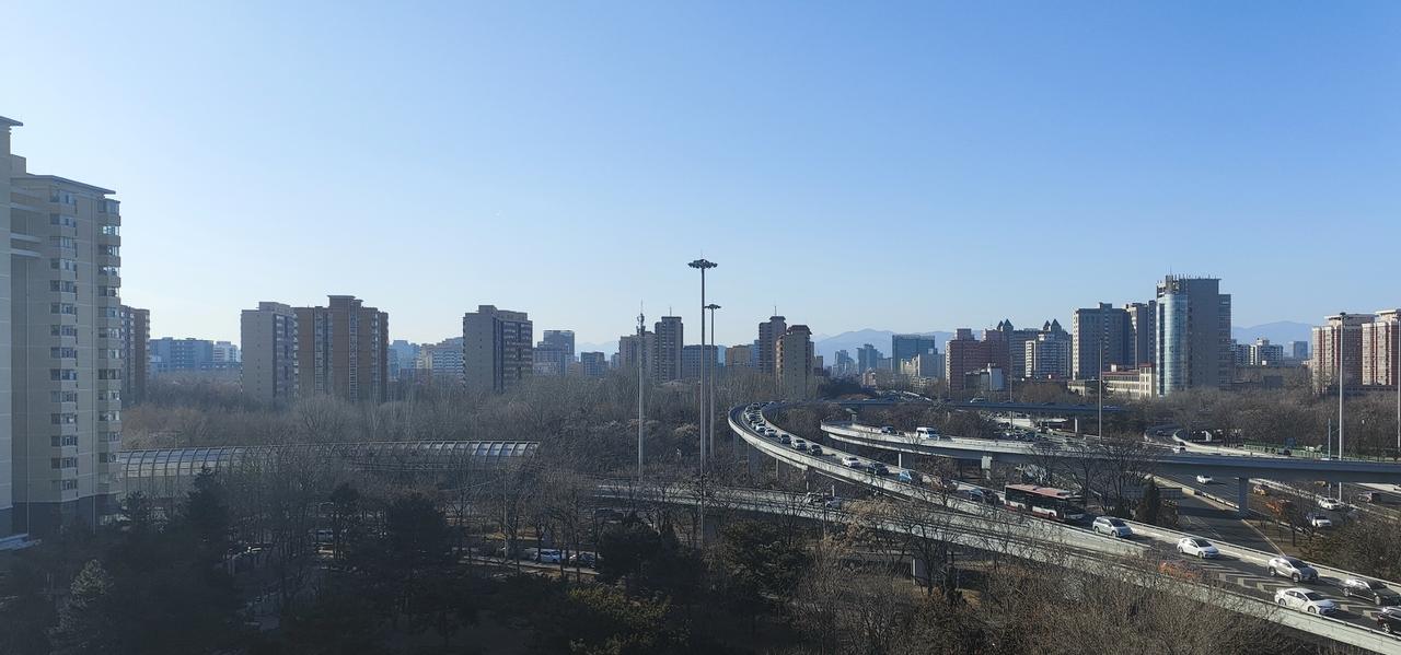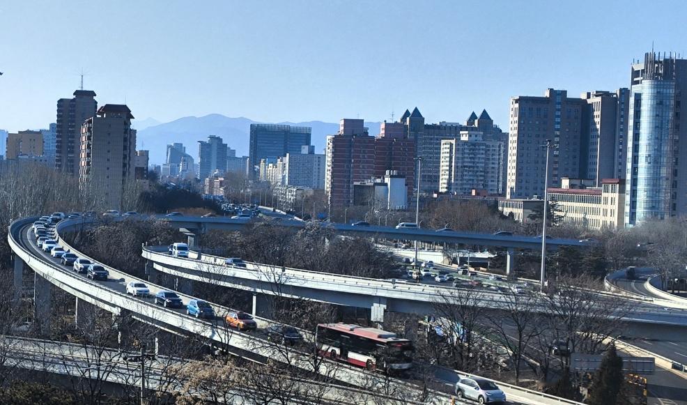 北京冬日一个平常午后,城市天际线交织高架上的车流...