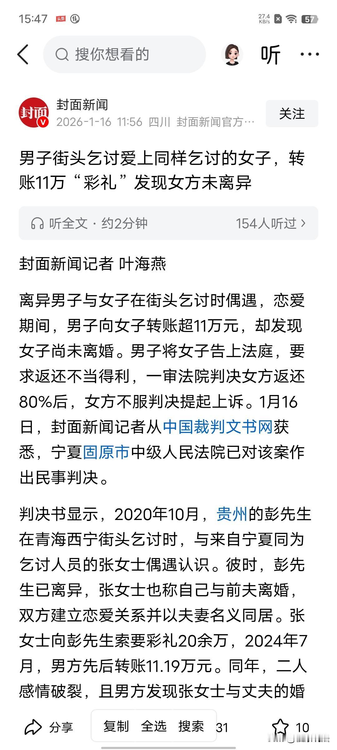 宁夏固原,离异男子乞讨时,偶遇一女子也在乞讨,女子隐瞒已婚事实,和男子恋爱并以夫妻名义同居,索要20余万彩礼要结婚,男子陆续给女子转账11.19万,不料,二人感情破裂分了手,男子却发现女子根本没离婚,便让她还钱,可女子一直不给,男子认为女子利用感情,以结婚为名骗钱,告上法院,让她还钱!可女子却说这笔钱是二人一起乞讨的钱和保姆费共计32万,不同意还钱,法院判决亮了。 2020年10月,街头的风冷飕飕的,贵州的彭先生衣衫朴素,为了生活,他缩在大街上乞讨。 可没想到,这种日复一日又艰苦无聊的生活,突然发生了转折,一次偶然,彭先生遇到了宁夏的张女士,巧的是,她也在乞讨,相同的经历,自然有共同话题。 彭先生跟张女士说了自己的情况,他早就离婚了,一个人过呢。 张女士长叹一声,说她也和前夫离婚了,自己没有什么本事,就选择了乞讨这种方式养活自己。 彭先生觉得张女士挺可怜的,一个女人走到这步确实挺不容易的,便心生怜悯,时不时的关心她一下。 一来二去,两人看对眼了,谈起了恋爱,后来两人干脆以夫妻名义同居了,在那出租屋里,想着以后能天长地久。 这恋爱谈着谈着,张女士就跟彭先生提出结婚,两人都处到这个份上了,不能总拖着,结婚的话,彭先生给20余万彩礼就行了。 彭先生一听,心里有点犯难,可他太想和张女士成个家了,一咬牙就同意了。 一转眼到了2024年7月,彭先生陆陆续续给张女士转了11.19万元。 每一次转钱,彭先生都觉得自己离结婚不远了,心里那叫一个美啊。 可是,好景不长,同年,彭先生和张女士不知道因为啥事,两人感情走到了尽头,谁都不想继续了。 偶然间,彭先生发现一件令他心寒的事,他发现张女士根本就没有和其丈夫离婚! 彭先生得知真相后,感觉自己被张女士当猴儿耍了,她不仅欺骗自己的感情,还骗走自己11万多块钱,他是既心碎又崩溃。 分手后,彭先生觉得自己被张女士欺骗了,他去找她想要回11.19万彩礼钱。 可没想到,张女士翻脸无情,不管彭先生怎么索要,她坚决不给。 彭先生非常气愤,觉得张女士为了要彩礼,就借着结婚为名,骗了自己的感情还骗了自己的钱。 于是,彭先生一纸诉状将张女士告上法院,要求她返还不当得利的11.19万元彩礼钱。 《民法典》第122条规定:因他人没有法律根据,取得不当利益,受损失的人有权请求其返还不当利益。 在这件事儿里,彭先生给张女士转了 11.19 万元,原本是奔着结婚去的,是基于对张女士已离婚且会和自己结婚的信任。 可他后来发现张女士根本就没离婚,这就意味着张女士获得这 11.19 万元是没有合法依据的。 彭先生因为转钱遭受了经济损失,而张女士却实实在在得到了这笔钱,所以彭先生以不当得利要求张女士返还钱款,在法律上是站得住脚的。 一审法院判决:张女士返还已支付彩礼的80%,也就是89536元。 一审判决后,张女士不服,提出上诉。 她说那笔钱不是彩礼,这是两人在一起5年乞讨赚的钱,一共32万元,所以,这笔钱是两人乞讨攒的钱还有保姆费。 首先解释一下,一审法院判决张女士返还已支付彩礼80%,为什么少给彭先生钱了呢? 要知道,法院没有判决张女士全额返还,而是酌定返还 80%,这可能是综合多方面因素考虑的。 一方面,彭先生和张女士在一起生活了一段时间,虽然张女士没离婚,但他们确实是以夫妻名义同居了。 在这段同居生活里,双方可能有一定的共同生活支出,比如一起吃饭、租房等费用,这些费用可能就从彭先生转的钱里支出了。 所以,法院考虑到这部分实际情况,没有让张女士全额返还。 另一方面,这也是一种公平原则的体现,既保护了彭先生作为受损方的合法权益,也兼顾了张女士在这段关系中的一些付出和实际情况。 从道德方面,张女士自称已离婚,让彭先生误以为可以和她组建家庭,甚至以夫妻名义同居。 但实际上她仍和丈夫保持婚姻关系,这种“脚踏两条船”的行为,本质上是利用彭先生的感情需求,为自己谋取利益。 再说回二审法院会如何判定呢? 张女士上诉称这 11.19 万元是“共同乞讨所得及保姆费”,但她拿不出证据来证明。 《民事诉讼法》第64条规定:当事人对自己提出的主张,有责任提供证据。 张女士没办法证明这钱是共同乞讨挣的和给她当保姆的钱。 而彭先生却能拿出证据证明自己转钱是为了结婚,属于彩礼性质。 所以,二审法院认为彭先生的证据更充分,张女士的主张没有依据。 2025年9月25日,二审法院判决:驳回张女士上诉,维持了一审判决。 这也给咱们大家提了个醒,在寻找爱情的道路上,可不能被一时的甜蜜冲昏了头脑,一定要擦亮眼睛,看清对方的真实面目。尤其是在涉及金钱往来的时候,更要谨慎再谨慎!