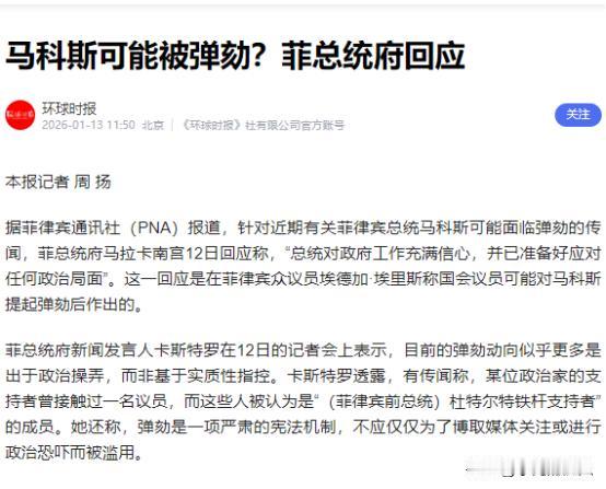 中方发出讨贼檄文后,马科斯面临弹劾,或已做好流亡准备   当地时间1月13日,多家菲律宾媒体报道称,总统马科斯已经做好准备,应对可能对他提起的弹劾案。不过,总统府新闻官卡斯特罗仍然强调,马科斯没有盗窃公款,没有卷入防洪工程腐败案,反而正在调查这起影响甚广的案件,所谓弹劾说法是“支持某位政治家的未证实的声明”。   在这之前,中方曾发出过相关声明,外界不少人将其称作“讨贼檄文”。其实中方这份声明的出发点很清晰,就是为了维护自身的合法利益,以及中菲之间正常的合作关系。   这些年中菲在多个领域都有合作,像基础设施建设、经贸往来、民生项目等,这些合作要顺利推进,离不开双方的相互信任和公平透明的环境。如果菲律宾这边出现可能破坏这种信任的情况,比如涉及中菲合作项目的腐败问题,或者有损害中方利益的举动,中方必然会表明自己的立场,这是任何一个主权国家维护自身权益的正常做法,完全合情合理。   再看马科斯面临的弹劾传闻,并不是突然出现的。那起防洪工程腐败案在菲律宾已经发酵了一段时间,不少民众对这个案子很关注,反对党更是紧紧盯着不放。要知道防洪工程直接关系到老百姓的生活安全,要是工程里存在腐败,资金被挪用或者工程质量不达标,不仅浪费国家资源,还可能在汛期给民众带来安全隐患。反对党本来就对马科斯政府的施政有不同意见,现在有了防洪工程腐败案这个由头,提出弹劾的想法也在情理之中,这也是菲律宾国内政治博弈的一种体现。   马科斯做好应对弹劾准备的举动,从政治角度来看也不难理解。按照菲律宾的宪法和法律规定,弹劾案一旦启动,会有一系列严格的程序,比如议会审议、调查取证等,整个过程对政府来说会消耗大量的精力,也会影响政府的执政稳定性。马科斯提前做准备,可能是想在程序上应对各种可能出现的情况,也可能是为了稳定政府内部和支持者的情绪,避免因为弹劾传闻引发更大的动荡。   至于有说法称马科斯“已做好流亡准备”,虽然总统府没有正面回应这种说法,但从菲律宾的政治历史和当前局势来看,这种传闻的出现也不是没有原因的。   过去菲律宾曾有过领导人因为政治危机而选择流亡的情况,所以外界在看到马科斯面临弹劾压力时,难免会产生这样的猜测。而且如果弹劾案真的朝着对马科斯不利的方向发展,比如最终弹劾成立,他不仅会失去总统职位,后续还可能面临法律层面的追究,在这种情况下,“流亡”或许会被视为一种极端的自保方式。不过目前这种说法还只是传闻,没有确凿的证据支撑,最终是否会走到这一步,还要看弹劾案的后续进展,以及菲律宾国内政治力量的平衡情况。   中方在这件事上的立场一直很明确,就是坚持不干涉他国内政。菲律宾国内的弹劾案属于菲律宾的内部事务,中方不会去插手其中的具体进程。   但同时中方也会关注这件事对中菲关系的影响,毕竟中菲是隔海相望的邻居,两国关系的稳定对双方都很重要。   如果菲律宾国内的政治动荡影响到中菲合作项目的推进,或者出现损害中方在菲利益的情况,中方肯定会通过适当方式表达关切,维护自身的合法权益。   之前中方的“讨贼檄文”,本质上也是对可能影响中菲合作基础的行为提出警示,希望相关方面能重视中菲关系,不要因为内部事务或不当行为破坏双方多年建立起来的合作局面。   现在马科斯政府面临的局面确实比较复杂,如果马科斯政府不能妥善处理这些问题,很可能会进一步失去民众的支持,进而加剧政治上的危机。   从目前的情况来看,菲律宾国内的局势还处于比较微妙的阶段。弹劾案是否会正式启动,马科斯政府如何应对后续的挑战,反对党会采取怎样的进一步行动,这些都还是未知数。外界能看到的是,马科斯政府正在努力通过总统府的表态来稳定局势,否认负面传闻,同时强调自己在积极处理腐败案;而反对党则可能会继续利用当前的舆论氛围,推动弹劾相关的行动。   中菲关系在这个过程中也面临着一定的考验。中方始终希望与菲律宾保持良好的合作关系。但这种合作需要建立在相互尊重、公平透明的基础上,如果菲律宾国内的政治问题影响到合作环境,或者出现损害中方利益的情况,中菲合作难免会受到影响。所以中方的相关表态,也是在提醒菲律宾方面,要重视维护中菲合作的良好氛围,避免因内部事务影响两国关系的大局。   总的来说当前马科斯面临的弹劾压力和相关传闻,是菲律宾国内政治、经济、社会等多种因素共同作用的结果。中方会继续秉持客观公正的态度,关注局势发展,同时坚定维护自身利益,推动中菲关系在相互尊重、平等互利的基础上健康发展。而马科斯政府最终会如何化解当前的危机,弹劾案会走向何方,还需要时间来给出答案,后续的每一个步骤都会对菲律宾的政局和中菲关系产生重要影响。