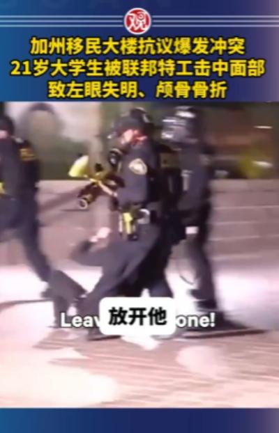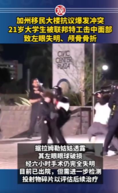 美国加州爆发抗议示威,一名21岁的大学生被特工一枪托爆头,眉骨断裂,眼睛失明。但
