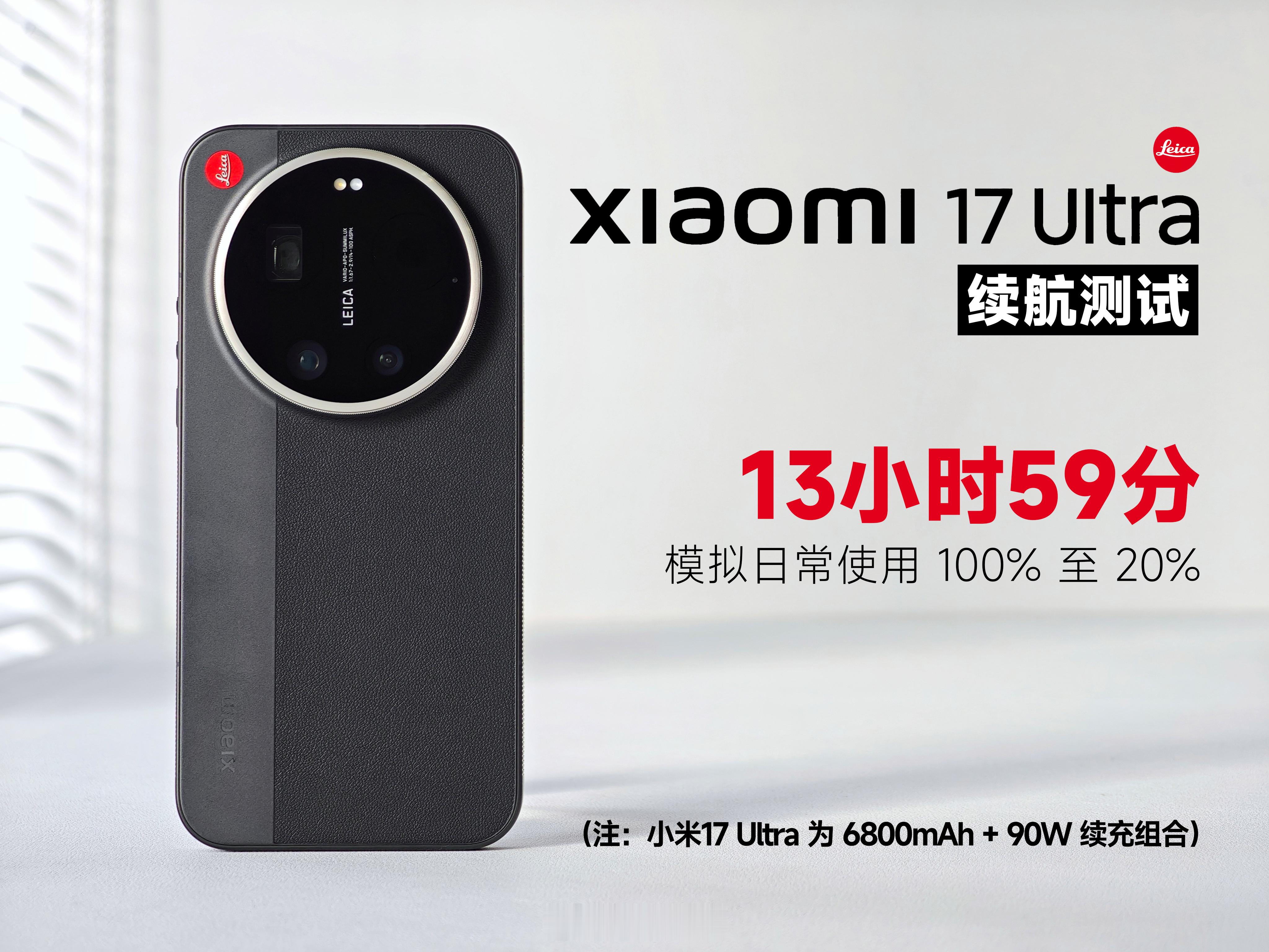 小米17 Ultra 的续航测试成绩来了! 从 100% 模拟日常使用至 20%,共耗时 13 小时 59 分。小米17 Ultra 为 6800mAh 电池容量,相较于小米15 Ultra 的 6000mAh 增加了 800mAh。但从测试结果来看,续航提升了约 54%。小米17Ultra 江苏小米之家