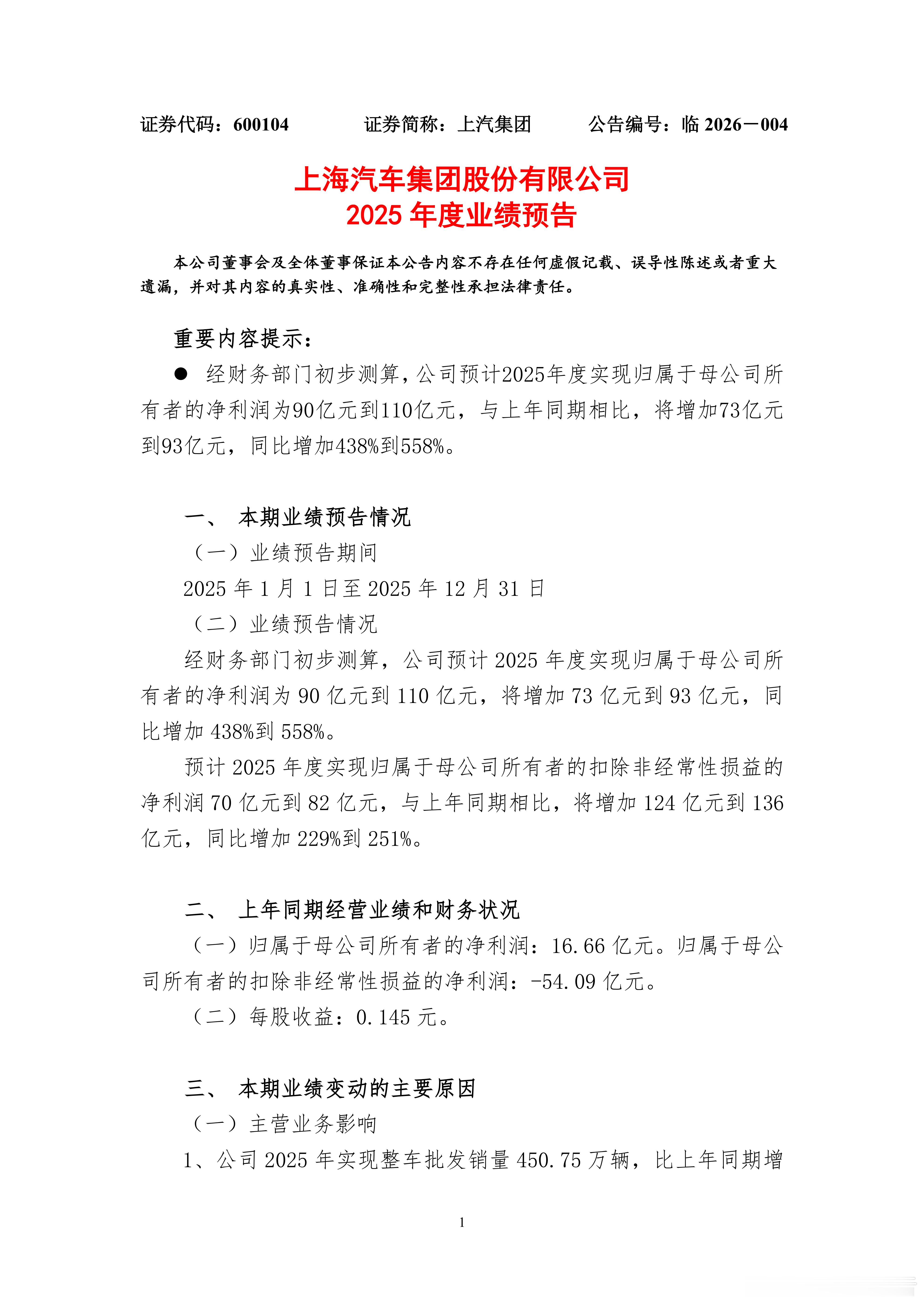 上汽发布2025年度业绩预告1月16日,上汽集团发布2025年度业绩预告。经财务部门初步测算,公司预计2025年度实现归属于母公司所有者的净利润为90亿元到110亿元,与上年同期相比,将增加73亿元到93亿元,同比增加438%到558%。汽场全开上汽上汽发布2025年度业绩预告
