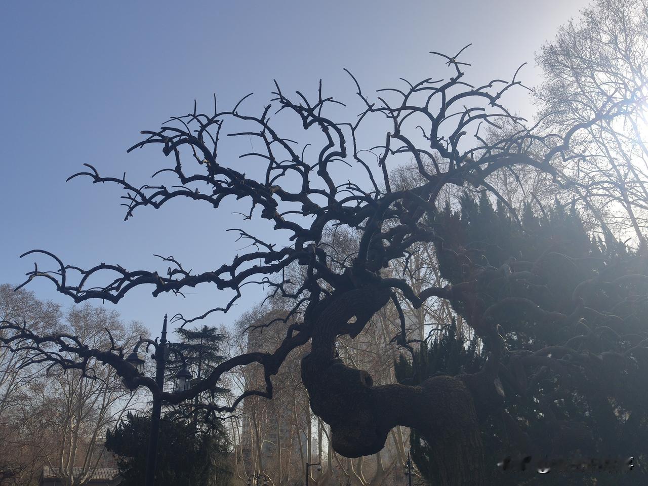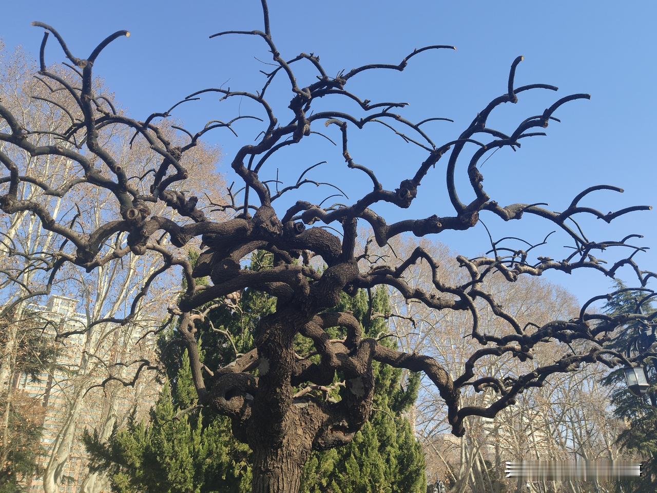 人民公园随手拍:看看郑州市人民公园莲花喷泉广场东、西两个出口处的这几棵(四棵)倒栽槐多么的苍劲有力,造型也是如此的奇特。由于住的距离人民公园比较近,所以闲暇之余的时间经常到这里转悠转悠,一般都是从西门进来,然后沿着主道经过八角亭、小白桥,然后到达莲花广场,再折向南,到公园南门,折回绕过胡公祠到人工湖东岸的竹苑,到东门然后西行到健身器材广场上,再取道手语岛,最后从北门出来。每天几乎都是这样的线路,一来是锻炼身体,二来是观赏公园里的风光和人文景观!但发现这几棵倒栽槐的沧桑美还是第一次。树叶落尽,尽显遒劲风采,像盘龙、似只只展翅高飞的鸟儿、更像直至苍穹的戟槊。 从树龄看应该有一些年头了!郑州市人民公园是郑州市解放后郑州修建的第一个公园,取名人民公园,寓意人民当家做主的意思。这几棵倒栽槐应该和广场周围的参天法桐一样和游园同时期出现的,应该是这个公园历史的见证者,它的每个褶皱里都储存着公园里的春花秋月,风雨雷电。以它们苍老而遒劲的姿态给每一位邂逅的游人无声的诉说着它所目睹的一切。