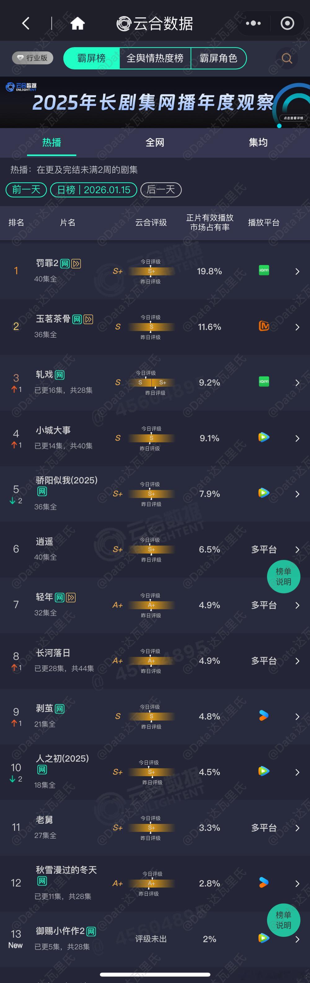 1.15云合占比(估值已发,粉见)罚罪VIP复更一集保持较好玉茗茶骨⏩超点完结,热播期到哪天未知,视非V更到哪天而定轧戏 云合播放评级降回S小城大事昨晚涨近500热度,播放量涨幅100万上下秋雪漫过的冬天 小涨御赐小仵作 首播400+万大生意人热播期结束🔚