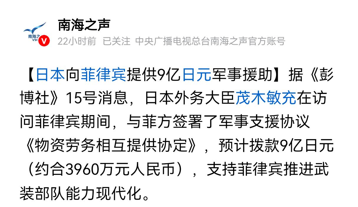 日本的第1个盟友出现了!花9个亿被拉入伙,中国回应揭开菲律宾伤疤 目前日本和菲律宾之间已经达成了一项准同盟协议,接下来日本将会向菲律宾提供9亿日元的军事援助。而按照该项协议,两国的武装部队在必要的时候,还将会为彼此双方提供相应的后勤支持,尤其是日本自卫队还可以被允许进入菲律宾本土。作为诚意,日本方面拿出9亿日元,并且表达了在南海问题上,对于菲律宾的支持。 16号当天我国外交单位回应了这件事情,我国明确指出,历史上日本军国主义曾经侵略过菲律宾,给这个国家带来了惨痛的损失和历史记忆。中国反对这种针对第3个国家的准结盟策略。 菲律宾确实是好了伤疤忘了疼,日本之所以要把菲律宾搞成自己的盟友,就是看中了菲律宾的地理位置,想要通过菲律宾把自己的武装力量推出去,同时也想在菲律宾境内搞一些军工试验,比如雷达,战舰等等。这样做的好处是可以帮助日本突破专守防卫,绕过国际限制和制裁。菲律宾现在因为蝇头小利成为日本的准盟友,有朝一日日本的野心真的开始实质性外扩的时候,菲律宾必然要付出代价。