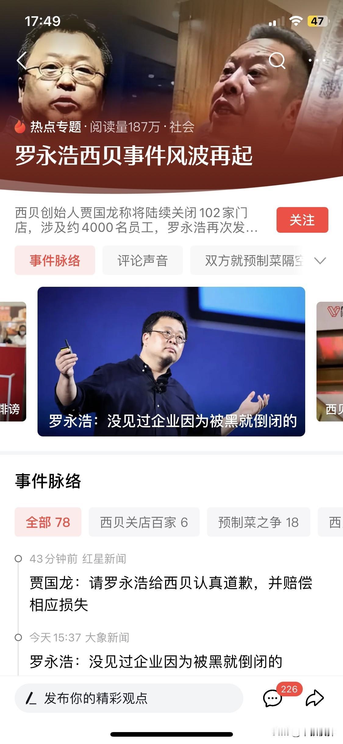 西贝贾老板这次是鼓足劲咬住罗永浩了。贾老板要求罗永浩道歉,赔偿。这家伙,隐隐约约感觉贾老板想和罗永浩交朋友。极限施压后目的是为了不打不相识。话说这个问题唯一解决办法是有关部门站出来判定西贝是不是预制菜!该出来发声了!