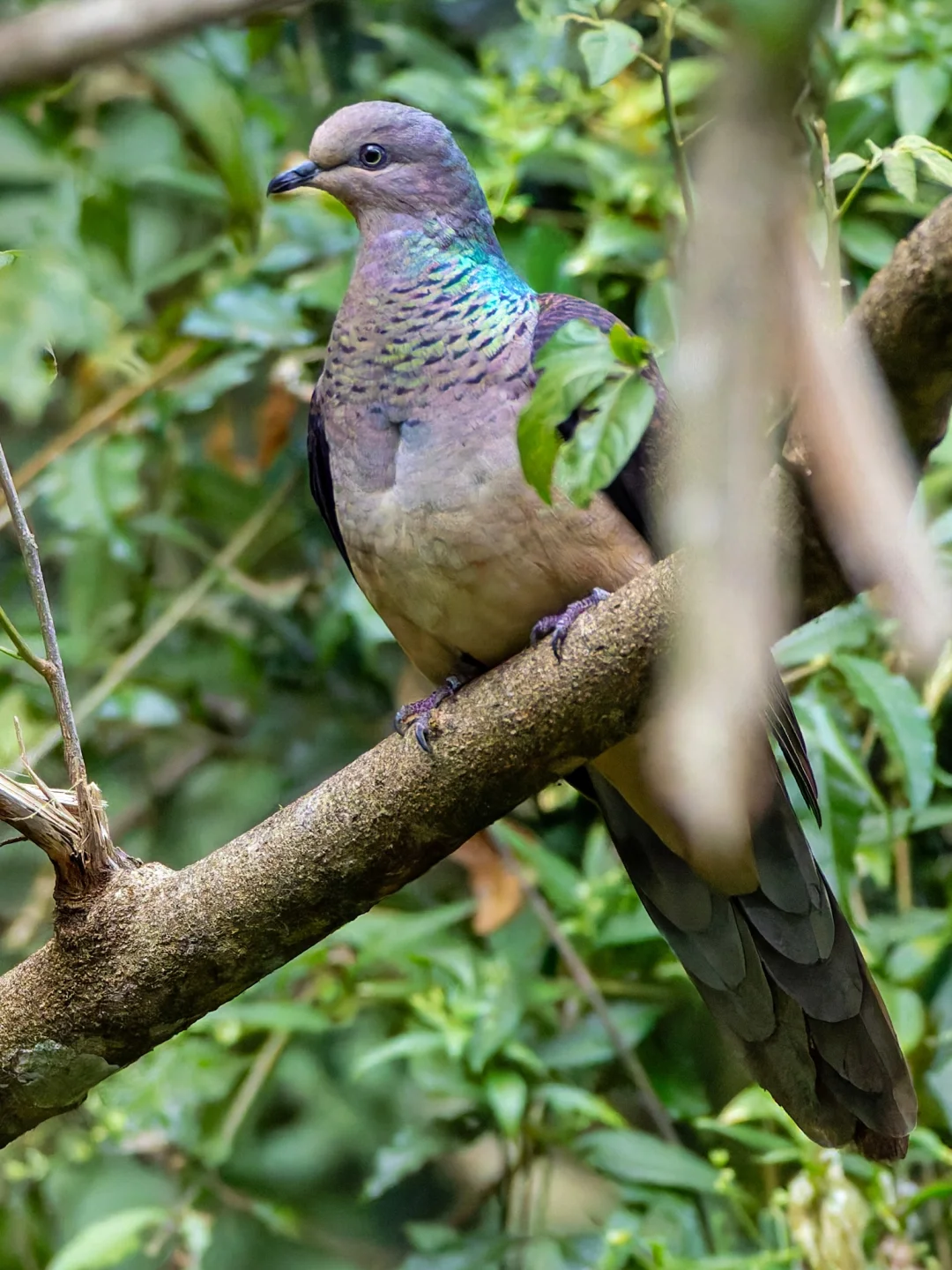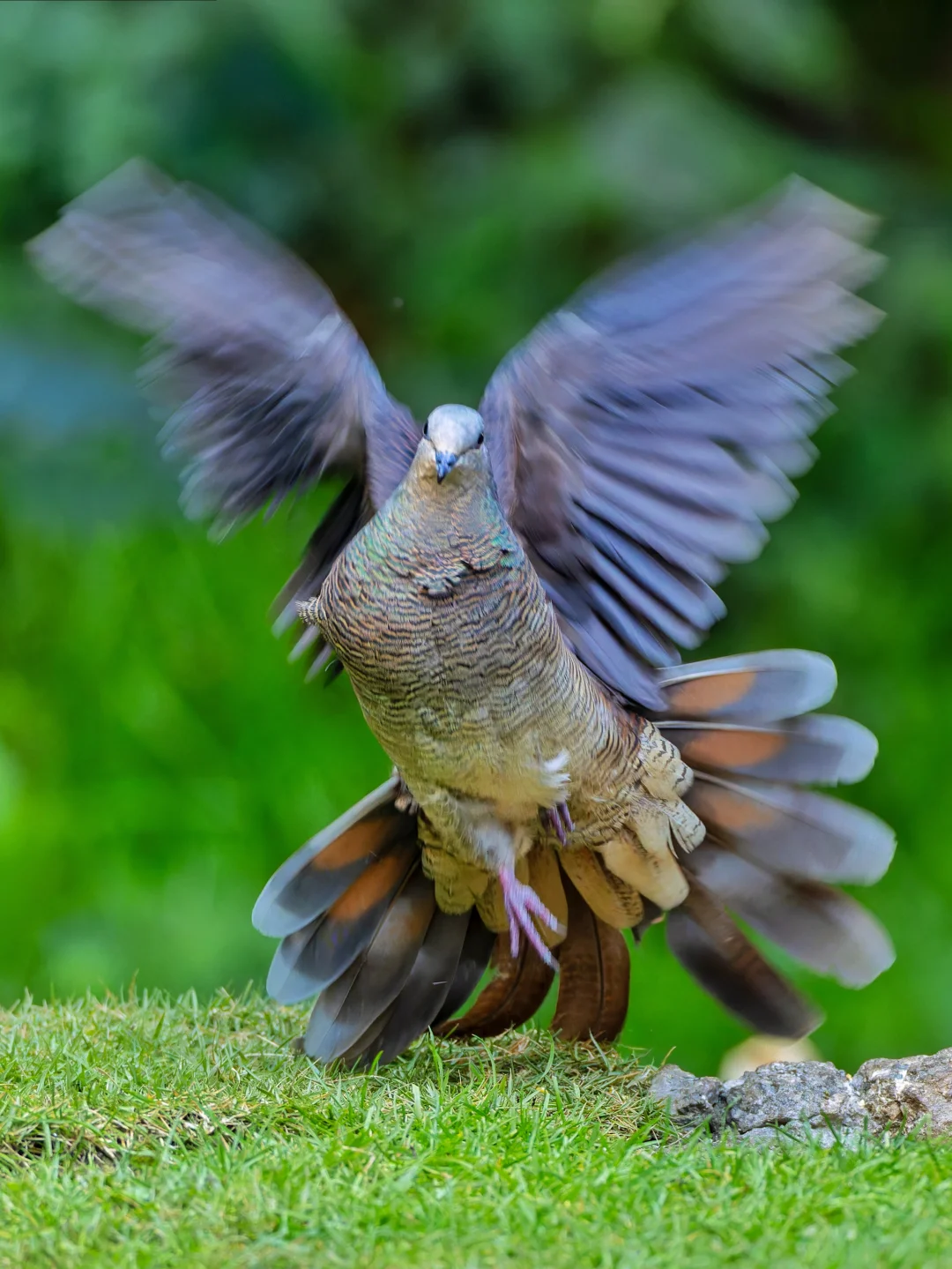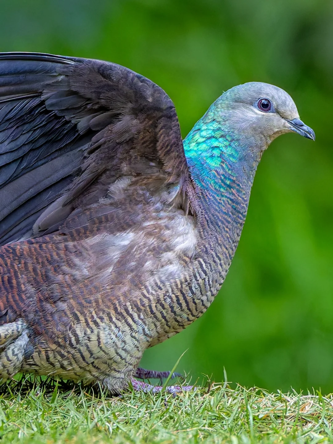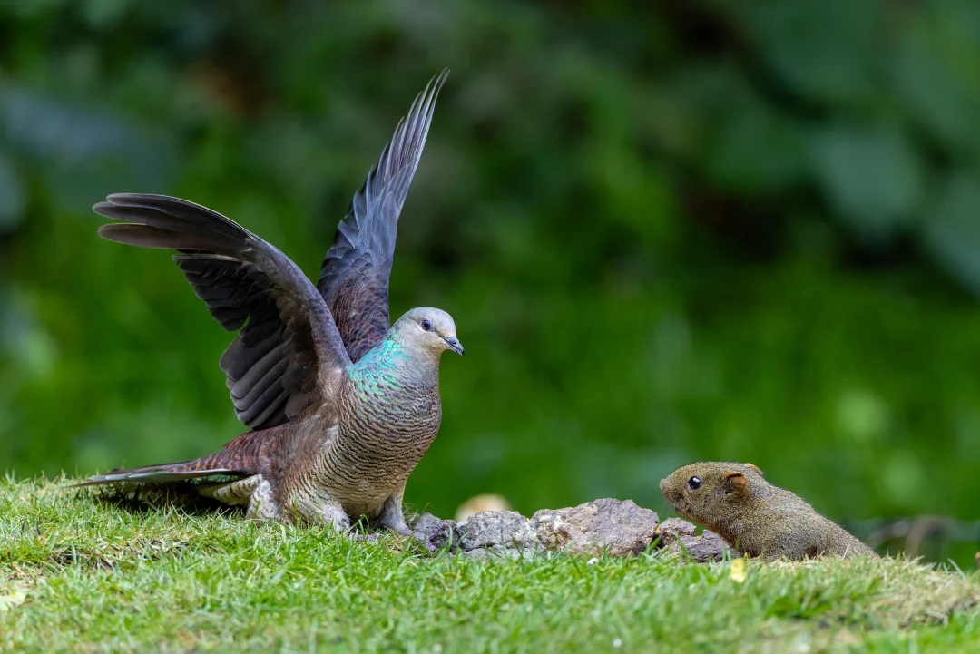 当时看到了这只“孔雀”鸽子,后颈闪着绿紫蓝的金属光泽,这哪是鸟,分明是鸟类界的“打光师”!本想在草坪上找找吃的结果被松鼠赶走,真是可怜。