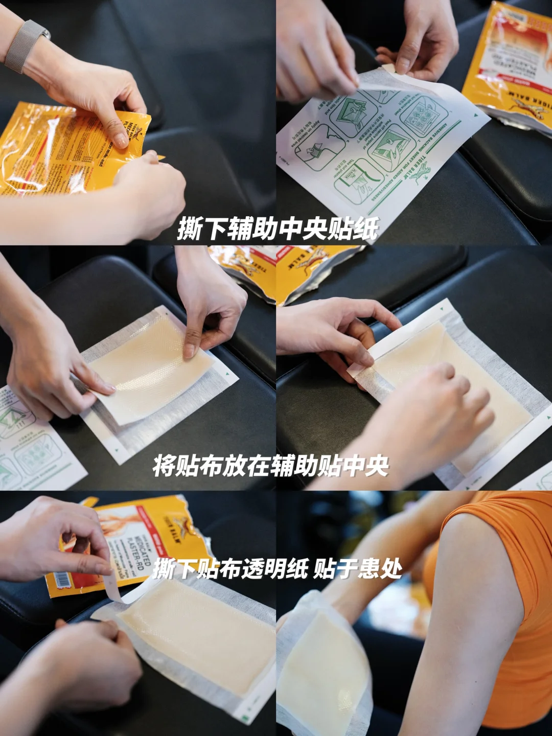 分享下正确使用方法,超简单:先撕下辅助贴中央贴纸,把贴布放在辅助贴中央,再撕掉透明纸和两旁纸条,直接粘贴在患处就行,新手也能轻松操作~