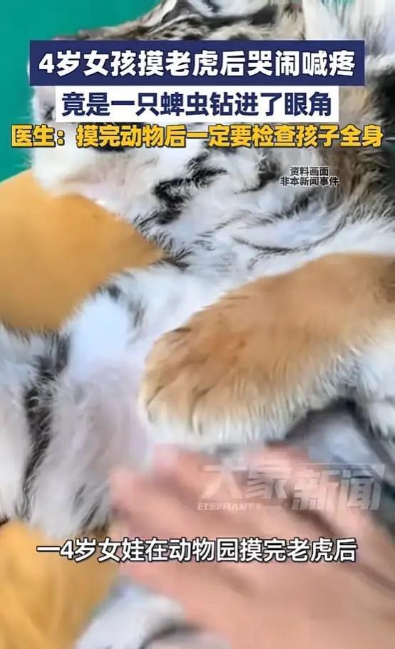 河南郑州,一4岁女孩在动物园摸完老虎后,突然哭闹不止,一个劲喊眼睛疼,还不停揉眼,家长仔细检查后,发现女孩眼角有个深色异物,就医后才得知,原来是一只蜱虫钻进了眼角皮肤,还吸饱了血!网友:头皮发麻! 周末阳光挺好,爸爸妈妈带着4岁的小姑娘涵涵去动物园玩。孩子看着笼舍里踱步的老虎,兴奋地伸手想隔着栅栏摸摸影子。谁也没想到,这次亲密接触竟藏了风险。 从动物园回来没多久,涵涵就开始揉眼睛,哭着喊疼。家长起初以为是小孩子玩累了闹觉,可孩子眼泪汪汪指着右眼内侧,一个劲儿说痒痛。妈妈凑近灯下一看,才发现孩子眼角附着个芝麻大的深色点状物,还会轻微动弹。 一家人急忙把孩子送到郑州市儿童医院,急诊医生检查后发现竟是只活蜱虫,已经将口器扎入孩子娇嫩的眼角黏膜。眼周皮肤薄、血管丰富,蜱虫偏偏选中这个位置,处理时稍有不慎就可能伤及眼睛或导致口器断裂。 医生立刻用精密镊子紧贴皮肤夹住蜱虫头部,匀速垂直向上施力,完整取出了这只“不速之客”。随后对伤口进行消毒,并叮嘱家长密切观察孩子后续有无发热等症状。 蜱虫俗称“草爬子”,可能寄生在野外环境中的鼠类或动物体表,动物园的动物若在户外活动,身上可能携带了蜱虫。被蜱虫叮咬后千万不要硬拽,它的头部有倒钩,生拉硬扯容易让口器断在皮肤里,可能引起感染或增加病原体传播风险。错误操作反而可能刺激蜱虫分泌更多唾液,增大感染风险。 带孩子去动物园或公园游玩,最好穿长袖衣裤,并把裤脚塞进袜子里。活动结束后仔细检查孩子全身,特别是腋窝、耳后、腹股沟等皮肤褶皱处。 蜱虫叮咬可能发生在任何户外活动后,哪怕是我们认为相对安全的场所,所以提高防范意识、掌握正确处理方法,才能让孩子安心探索自然。 各位读者你们怎么看?欢迎在评论区讨论。