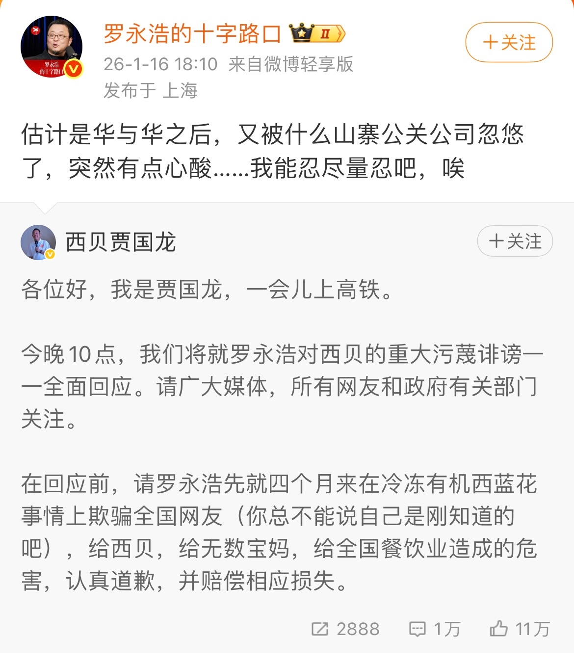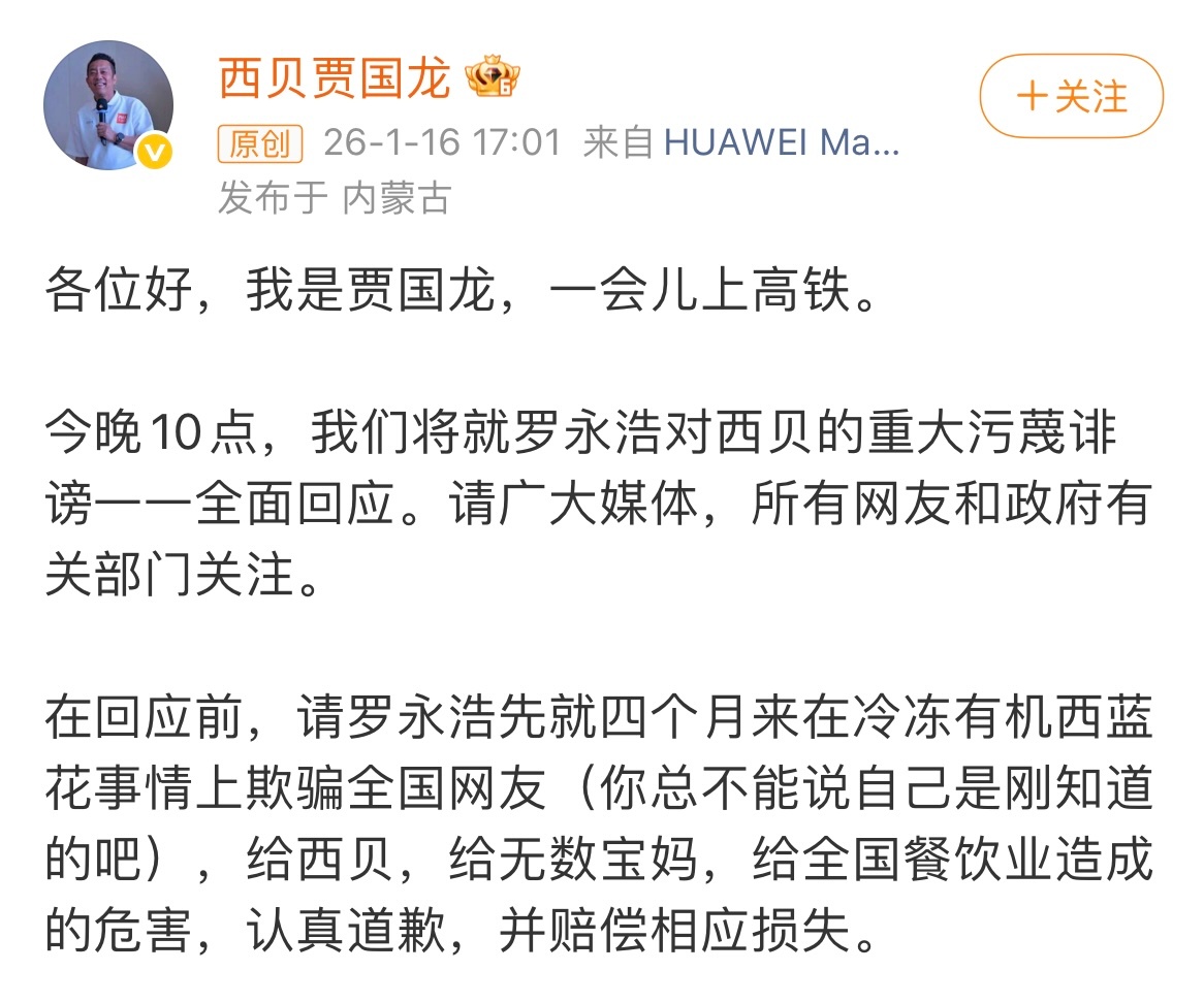 贾国龙称:今晚10点将对罗永浩的污蔑诽谤全面回应,要让罗永浩给西贝,给无数宝妈,给全国餐饮业道歉赔偿贾国龙今晚10点全面回应贾国龙让罗永浩道歉赔偿罗永浩 贾国龙