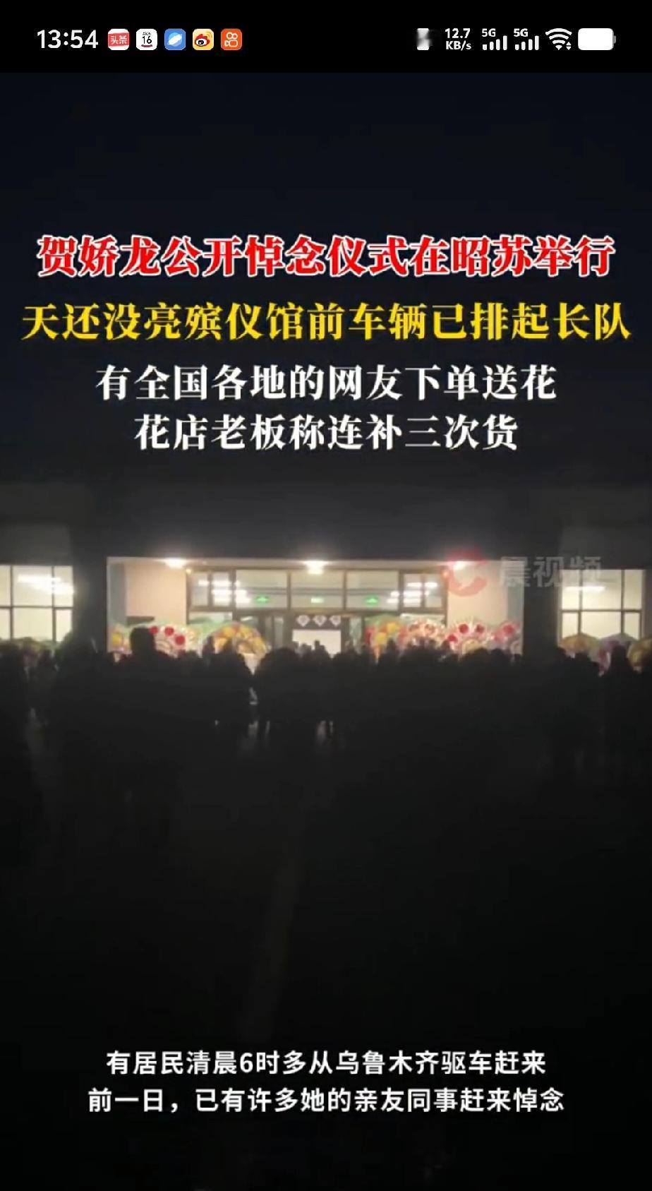 贺娇龙的葬礼我的朋友去了,她说她去到当地宾馆都住满了,都是全国各地赶去送贺娇龙最后一程的,但是宾馆一直都没有涨价,当地人都说贺娇龙是一个好人,可惜天妒英才,她的离世是新疆人民的损失。 花店的花也早就了卖完了,幸亏她聪明早就准备了花带去。到了殡仪馆现场她还是被震惊到了,不仅殡仪馆门前摆满了花,而且前去悼念的人还排起了长队。