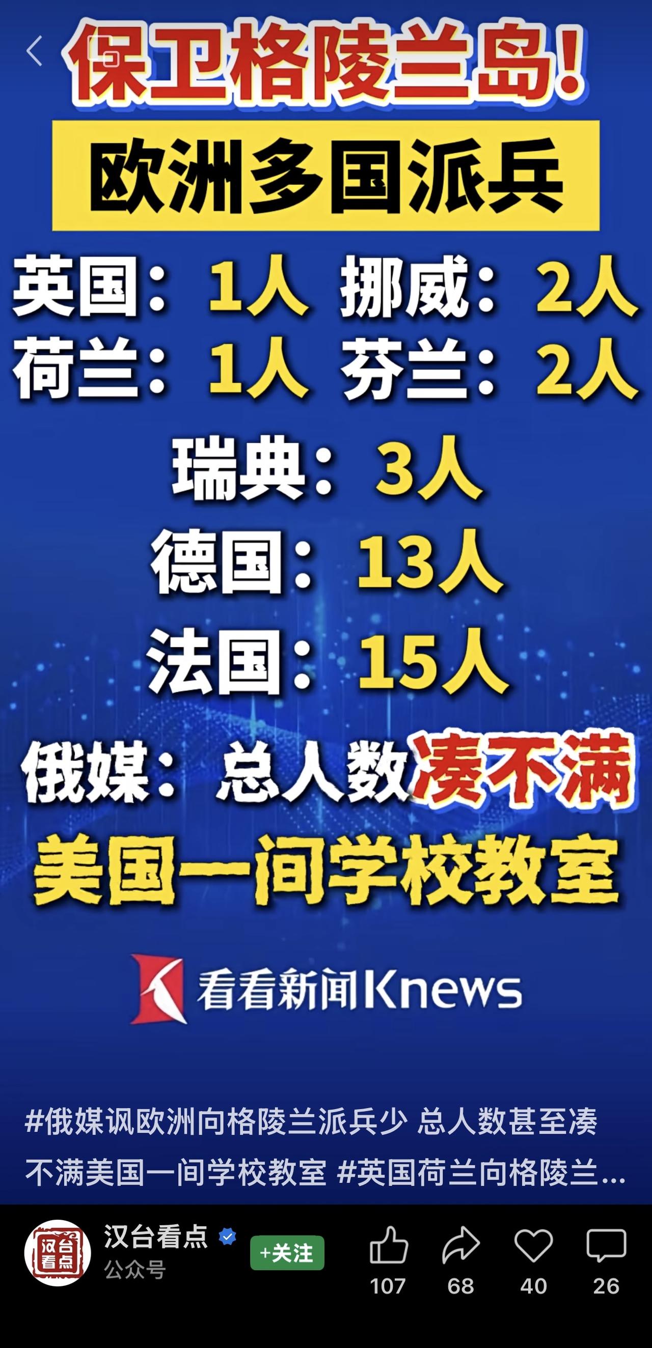 美国:美方已经知晓欧洲国家的出兵计划,但不会影响美国针对格陵兰岛的决策目标。 丹麦:任何不尊重丹麦领土完整和格陵兰人民自决权的想法,对丹麦来说都是完全不可接受的。 格陵兰:必须再次强调,我们非常重视加强与美国的合作。但这并不意味着 我们希望被美国所拥有。