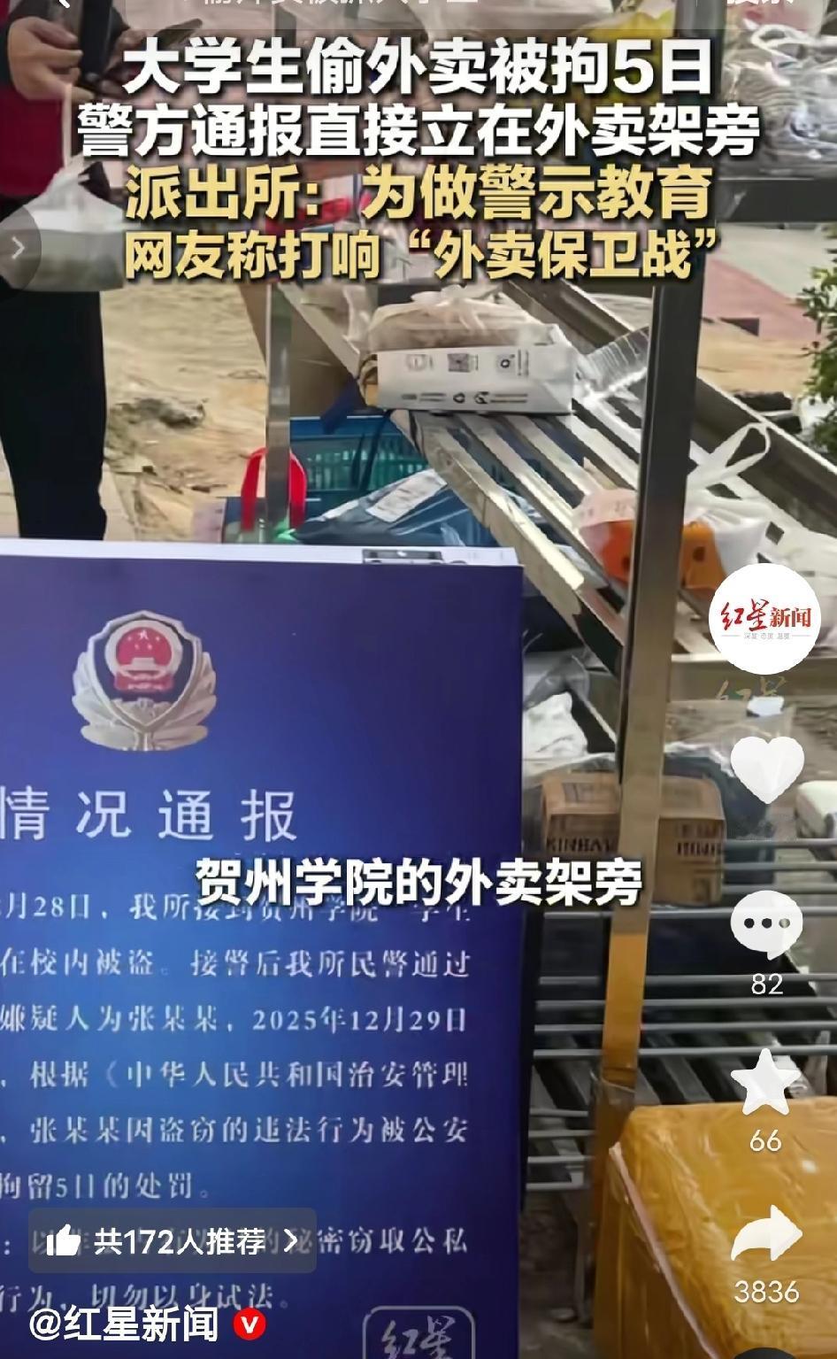 怒了!贺州学院大学生多次偷外卖被抓,警方把处罚通报钉在外卖架旁,这波操作瞬间炸锅!到底是大快人心的精准打击,还是毁人一生的公开羞辱? 2025年12月28日,贺州学院一名学生报警称自己的外卖被盗。警方通过调取监控,很快锁定了嫌疑人张某某,他是该校的一名在读大学生。 经调查,张某某不是第一次偷外卖,此前已有多次作案记录。根据《治安管理处罚法》,他因盗窃被处以行政拘留5日的处罚。 为了遏制校园里频发的外卖被盗现象,当地派出所决定“精准警示”,直接把警方通报立在了学校的外卖架旁。通报上清晰标注了张某某的姓氏、违法事实和处罚结果,路过的学生一眼就能看到。 派出所表示,这是为了做警示教育,提醒大家不要触碰法律红线。 这一做法立刻在网上火了,网友们吵翻了: 有网友支持:“偷外卖太恶心了,就该让他‘社死’,看谁还敢偷!” 也有网友质疑:“教育的目的是改过自新,不是公开羞辱,这样会毁了一个学生。” 还有网友调侃:“这是真正的‘外卖保卫战’,以后拿外卖都要自带身份证了!” 说句实在话,这件事我觉得挺矛盾的。 一方面,偷外卖确实是个让人深恶痛绝的行为,警方用通报立在货架旁的方式,确实能起到立竿见影的警示效果,保护了大多数学生的利益。但另一方面,这种“社死式”警示也可能让涉事学生背上一辈子的心理包袱,甚至影响他未来的人生。 其实,最好的教育从来不是“一棍子打死”,而是让犯错的人真正认识到错误。希望学校和警方能在警示和保护之间找到更好的平衡,既能打击歪风邪气,也能给年轻人一个改过自新的机会。 毕竟,我们要的不是“一次性的警示”,而是“一辈子的警醒”。 你支持这样的警示做法吗? 大学生偷外卖 外卖保卫战 广西贺州学院 警方通报 警示教育争议 来源:红星新闻