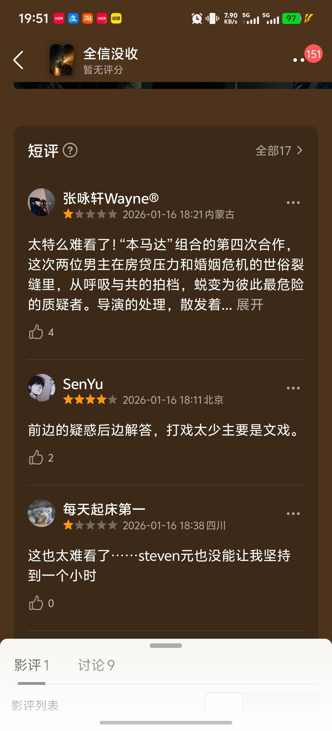 本来打算今晚看大本联手马特·达蒙主演的 Netflix新片《全信没收》,结果一翻评分,三个评分里两个一星,我还看么