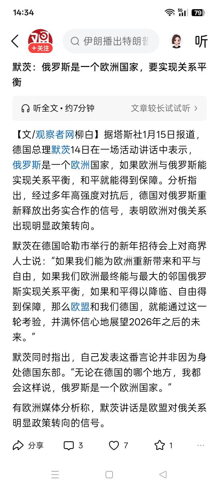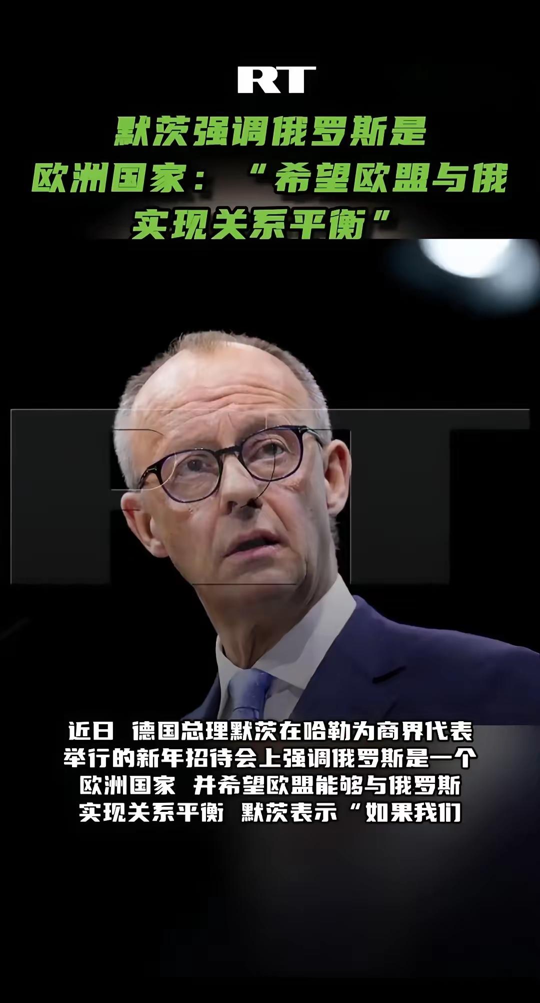 这是让特朗普听的? 一贯对俄罗斯持十分强硬态度,坚定不移支持和援助乌克兰的德国总理默茨,突然之间表示好像欧洲与俄罗斯的关系非常重要,甚至是可以共国承担这次大概还是史无前例的考验。 这可能与目前在格陵兰岛出现的新情况有直接关系。合纵连横,远交近攻,不仅仅是早在古代已经被人们使用,也是现代人类进行国际活动的重要组成部分。默茨之所以突然转变思路,估计当然也是对肆意妄为,不可一世的霸权主义的强烈反应和还击。 但是,默茨也是有条件的,那就是和平和自由,首当其冲的、最主要的当然是自由。而且,估计默茨在这里的自由,好像是有具体所指的,那就是乌克兰的自由。因此,事情大概远远没有某些人想象的那么简单。