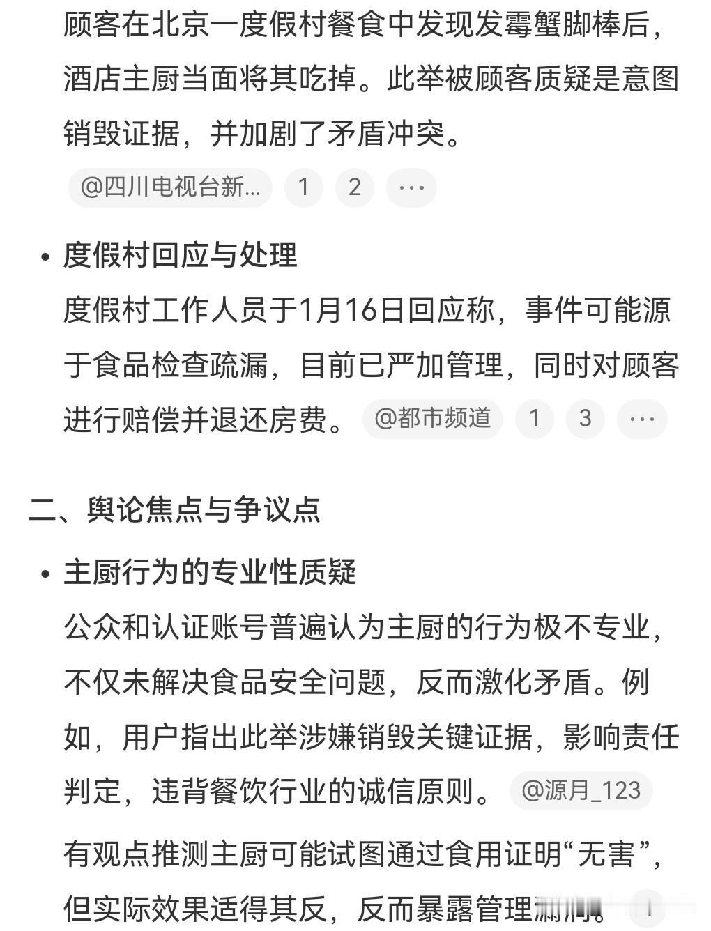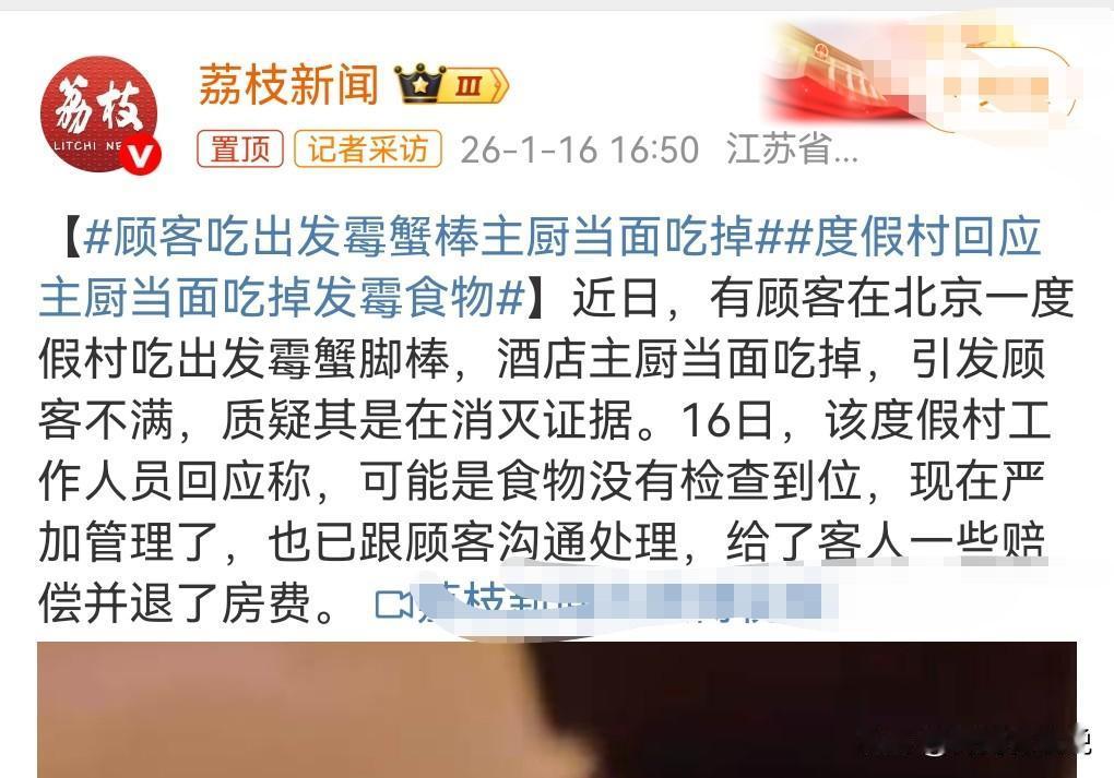 这厨师可真是个狠人,也是非常的狡猾呀。 近日有顾客在北京一度假村吃出了发霉的蟹脚棒。 没想到主厨竟然当面吃掉了。 这很显然的就是在消灭证据啊。 这厨师可真不地道啊。 最终给予顾客一些赔偿并退还房费。 所以说食品安全马虎不得。