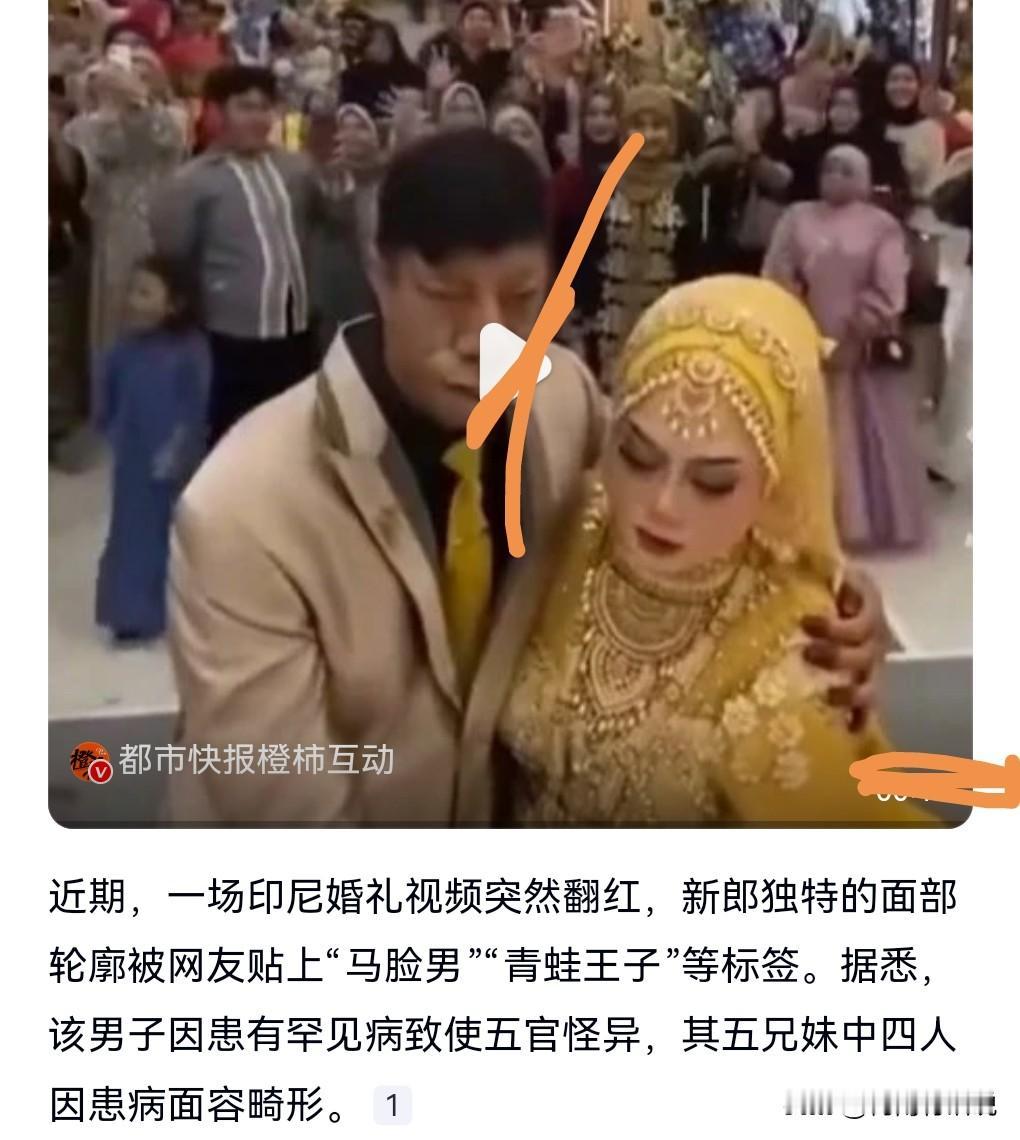 这真的是太让人羡慕了吧。一个长相丑的男人竟然娶了一个大美女。 这女的到底图什么了? 网上说这男的也没什么钱啊。 难道这就是传说中的爱情吗? 男的是得了一种罕见病,家中五兄妹,有4个人都是这种脸型。 只有最小的妹妹是正常脸型。