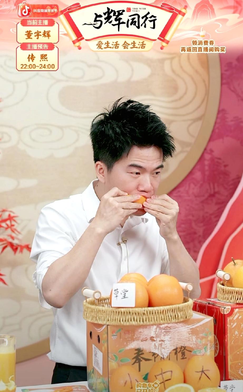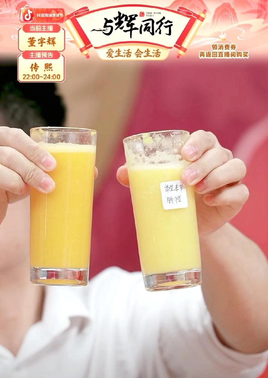 董宇辉的嘴是真厉害,尝了一口就知道两杯橙汁中有一杯是带皮榨的。还说自己榨的橙汁不好喝,还是吃橙子吧。 难道这是品尝产品多了,得到的经验?曾经盼盼就说宇辉特别厉害。吃东西一尝就能尝出来食材的品质和新鲜程度。 刚刚董宇辉在讲橙子的时候,端起一杯橙汁尝了一口,就说:“这是放时间长了,氧化了?还是怎么回事?有点苦。”然后拿了两杯一比较说:“这杯橙汁看颜色就一定是连皮榨的。”然后说自己榨的橙汁真的没有饮料好喝。那可不是吗?你喝的饮料当中别人给你添加多少香精、添加剂还有糖分。 不过,看董宇辉吃的那么带劲,可以放心一点,这个橙子绝对不酸,一定是很甜的,喜欢吃甜的,不喜欢吃酸的朋友可以放心下单了。 董宇辉 与辉同行