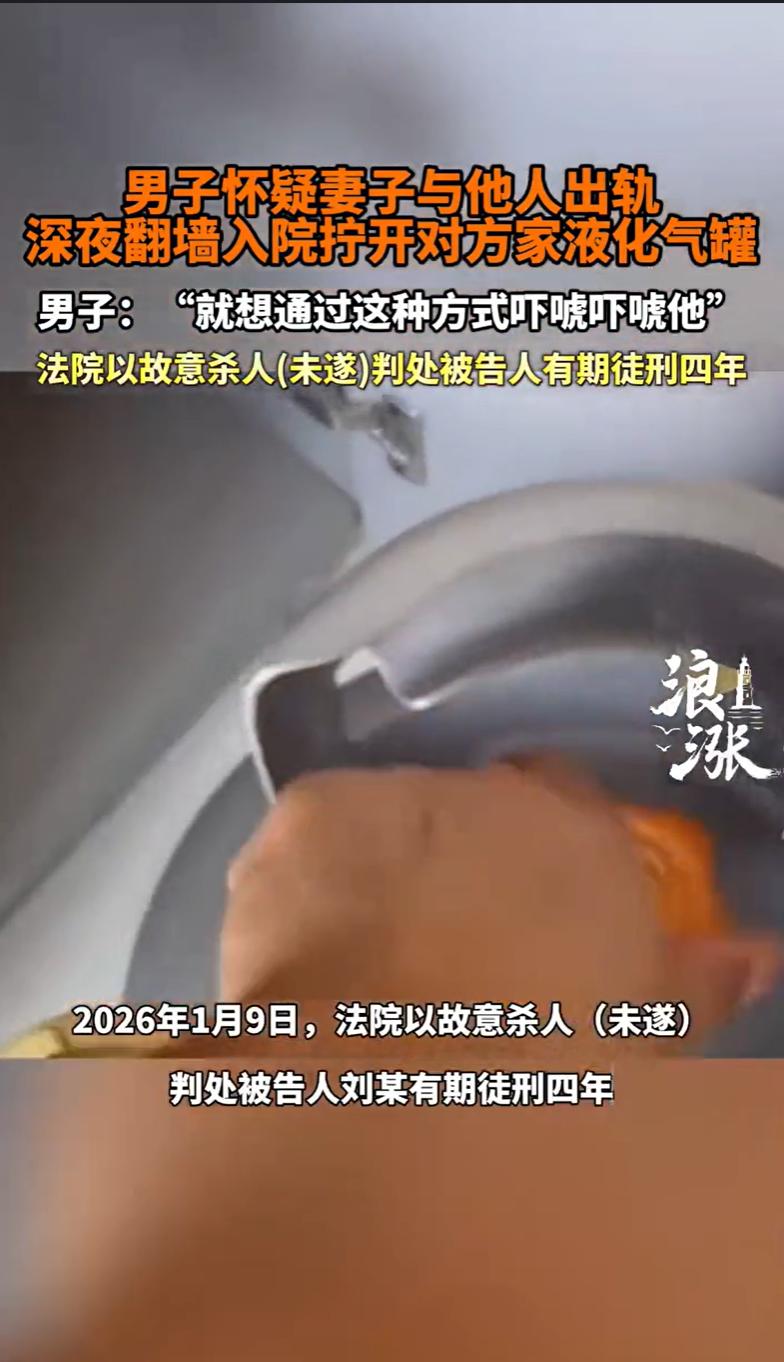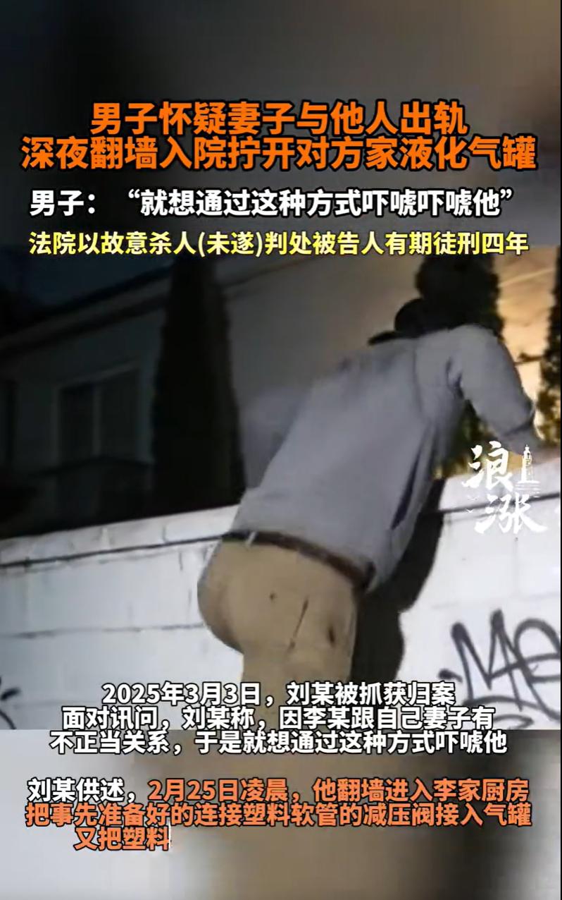 河南西平,一男子怀疑妻子与邻居有 染,心生恨意,备好梯子、软管,凌晨翻入邻居家院子,悄悄挪出厨房的液化气罐,将软管一头接上阀门,另一头塞进客厅门缝。黑暗中,男子拧开了角阀,气体咝咝作响地涌入熟睡者的房间。庆幸的是,邻居的妻子闻到异味惊醒,后果断报警。事后,男子辩解:“我就想吓唬他,走前还按了按钮关上气了。”但这说法被警方证实不实,因那个减压阀根本关不住气体。办案人员还发现,男子作案前曾用手机反复搜索“毒药致死”和“煤气中毒时间”。检察院以故意杀人罪对男子提起公诉,男子辩称自己顶多是非法侵入住宅,否认有杀人意图。法院判决出乎意料。   2025年2月25日凌晨4点左右,村民李某的妻子从睡梦中醒来,起身去厕所,当她穿过自家客厅时,一股浓烈而刺鼻的液化气味扑面而来。   李某的妻子心里一紧,睡意全无,顺着味道寻去,发现原本安放在厨房角落的液化气罐,不知何时被移到了厨房门口,而且罐体的角阀竟然被人拧开了,连接气罐的软管被扯出来,另一头塞进了客厅的门缝里。   李某的妻子赶紧屏住呼吸,冲过去关闭了角阀,并叫醒了还在熟睡的丈夫李某。   惊魂未定的李某检查了家中物品,发现确有被翻动、损坏的痕迹,随即报警。   警方赶到后,初步勘查认定为非法侵入住宅案件,通过调取村内及周边路口的监控视频,警方发现了一辆形迹可疑的车辆曾在案发时段出现在李家附近。   经过“以车找人”,警方迅速将目光锁定在同村村民刘某身上。   2025年3月3日,刘某被抓获归案。   面对讯问,刘某起初表现得既懊悔又有些“委屈”,他承认,是自己翻墙进入了李家,并动了液化气罐。   但刘某反复强调,这么做只是因为怀疑李某长期与自己的妻子保持不 正 当男 女关系,心中积怨,想用这种方式“吓唬吓唬他”,给他一个教训,并非真想害人性命。   刘某还提供了一个细节,在自己离开前,想起了售卖减压阀的店主说过“再按一下按钮就能把气关掉”,于是按了连接在气罐上的减压阀按钮,确信气体停止泄漏后才翻墙离开。   刘某强调,自己主观上只是想制造恐慌,没有杀人故意。   随后,公安机关最初以涉嫌非法侵入住宅罪对刘某刑事拘留。   然而,检察官审阅卷宗时,发现一些端倪。   根据李某家人的证言和李家日常用气习惯推算,案发前,那个13公斤标准罐装的液化气罐内,至少还有半罐,也就是约6.5公斤的液态石油气。   现场勘查也证实,案发后罐内已基本无剩余。这意味着,在案发时段,有大量液化气被释放到了空气中。   其次,一位与刘某、李某均相熟的证人向警方提到,就在案发前不久的春节期间,刘某曾到他家走亲戚,期间情绪激动地说过“死也要拉个垫背的”这样的话。   最重要的是,警方依法调取的刘某手机电子数据,记录显示,案发前两天,刘某曾在手机上频繁搜索“什么药放水里喝了必 死”、“一分钟内死 亡的毒 药”等内容。   而在2月25日凌晨作案前,他的搜索关键词变成了“闻20分钟的煤气会中毒吗”、“密闭小屋煤气能扩散进去吗”。   此外,侦查人员找到了售卖减压阀的店主进行核实,店主明确表示,不记得曾对刘某说过“按按钮就能关气”这样的话,并且对自己所售减压阀是否具备此功能也不确定。   检察机关认为,刘某的行为涉嫌故意杀人罪(未遂),而非简单的非法侵入住宅。   2025年3月17日,检察机关以涉嫌故意杀人罪(未遂)对刘某批准逮捕。   此后,检察院进行了多次试验,还委托了专家论证,证实刘某有故意杀人嫌疑。   2025年10月10日,检察院以刘某犯故意杀人罪(未遂),依法向法院提起公诉。   法院会如何判决呢?   《刑法》第二百三十二条规定,故意杀人的,处死刑、无期徒刑或者十年以上有期徒刑;情节较轻的,处三年以上十年以下有期徒刑。   第二十三条规定,已经着手实行犯罪,由于犯罪分子意志以外的原因而未得逞的,是犯罪未遂。对于未遂犯,可以比照既遂犯从轻或者减轻处罚。   法院指出,刘某在手机搜索“毒药致死”“煤气中毒时间”等记录,清晰地反映了其追求或放任他人死亡结果发生的心理状态,远超“吓唬”范畴。   刘某深夜翻墙、释放大量液化气的行为,直接创设了足以致人死亡的高度危险,符合故意杀人罪的构成要件。   侦查实验证实,刘某所称的按压减压阀行为,客观上根本无法阻断气体泄漏,不具备“有效性”。   而刘某之所以中止是因被害人李某家人偶然发现而中断,系意志以外原因未得逞,属犯罪未遂。   法院认为,刘某行为已构成故意杀人罪(未遂),而非法侵入住宅的行为被吸收。   不过,刘某到案后能够如实供述,且其行为未造成实际人身伤害后果,综合考虑其犯罪动机、手段、危害后果、未遂情节及认罪态度等因素,依法可以减轻处罚。   最终,法院判处刘某有期徒刑四年。   对此,您怎么看?