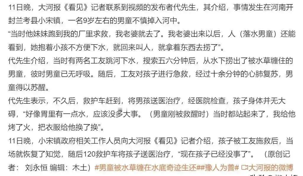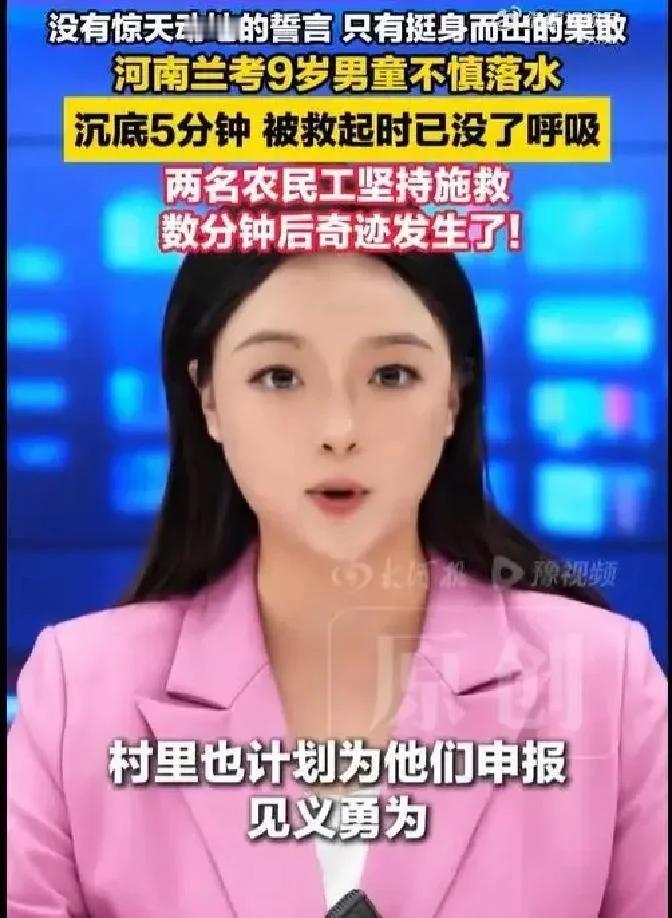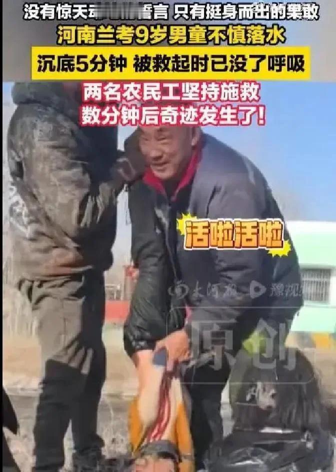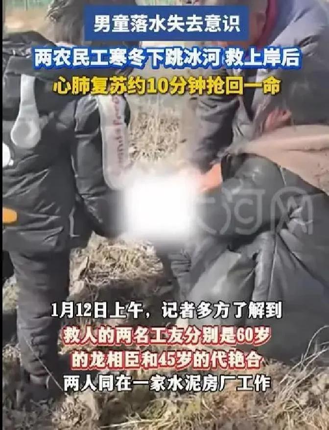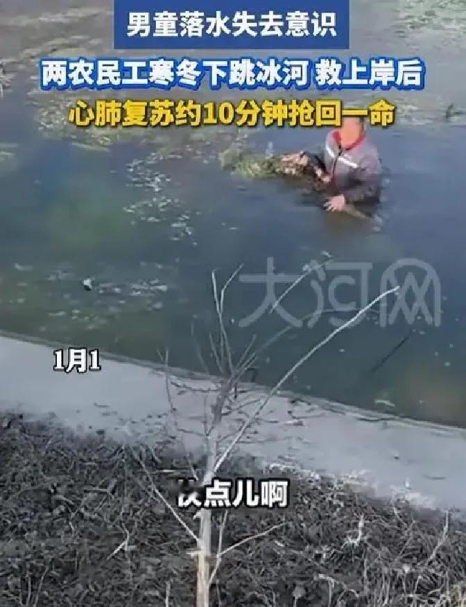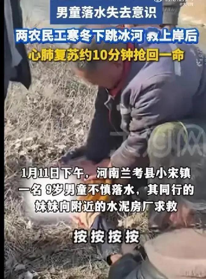 1月11日,河南兰考。 一9岁男童掉进河里。两名农民工穿着衣服跳进冰河,把孩子拖到岸上,孩子已经停止呼吸,他们为孩子做了10分钟心肺复苏,孩子得救了。工厂厂长发了话,工资照发,手机进了水,厂里给买新的。村里为两人申报“见义勇为”称号。 两位朴实的农民工,忠厚老实,眉头都没皱一下,直接跳进河里,这哪里是救一个孩子,这是救了一家人。两人加起来一百岁了,等于拿命救命,真的是舍己为人,申报见义勇为是必须的。 还有工厂老板,因为你的支持,让爱有了温度。给这样的老板打工,农民工更有干劲了。