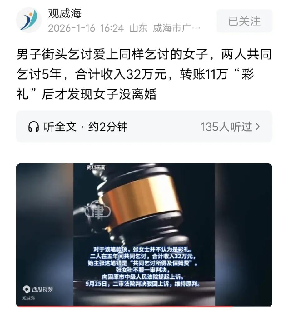 青海西宁,一男乞丐爱上一女乞丐,两人很快同居在一起,从此以乞讨为生,4年后,男子跟女子求婚,女子要求他支付20万彩礼,谁料,男子给了11.9万彩礼后发现,女子并未跟她前夫离婚,他一气之下把女子告上法庭要求退还11.9万彩礼,法院最终判决返还80%即:89536元,没想到,女子却坚称,那11万是共同乞讨所得和保姆费用。法院最终判了。 彭某是贵州人,曾经有过一段婚姻,但因为种种原因,最终跟前妻离婚了。 彭某跟前妻分开后,离开家乡,来到青海谋生,但是来到青海后,并没有他想象的那么好,找了一段时间的工作,连连碰壁。 彭某无奈,最终以乞讨为生,后来,做的时间长了,他发现,乞讨也能让自己收入不错。 2020年10月份的一天,彭某出门乞讨,遇到一个同行女孩,她长相不错,声音也温柔。 后来通过聊天,女孩告诉彭某她姓张,来自宁夏,也是因为生活所迫才走这一条路。 两人越聊越投机,越聊越有一种相见恨晚的感觉,彭某告诉张某他离异,目前单身。 张叹了口气,回应彭某说,他们两个有着同样的遭遇,她说她也曾经有过一段婚姻,但是因为种种原因,跟前夫离婚了。 因为相同的遭遇,两人之间的距离更拉近了一些。 从那天起,彭某和张某时不时就相约聊天,一起出门玩,随着交往的深入,他们之间发生了微妙的变化。 不久后,彭某和张某确定恋爱关系,很快就租房同居生活到一起。 两人也在青海等地一起以乞讨为生。 在一起几年后,彭某觉得该给他们的感情一个交代,于是,就提出要跟张某领证结婚。 张某说,结婚可以,但是她要求彭某给她20万彩礼。 2024年7月份,彭某把11.9万元转给张某,他告诉张某先给她一部分彩礼,等过段时间再凑够个8万一共20万给她。 彭某以为,他们的感情顺顺利利,两人最终能走进婚姻的殿堂。 万万没想到,彭某刚给张某11.9万彩礼不久,却意外发现,张某并没有跟她前夫离婚。 彭某得知这个消息,震惊不已,既然她没有离婚,那他们在一起的这4年算什么? 一时之间,彭某的心里五味杂陈,他既心痛,又很生气,同时也觉得张某耍了他。 4年来彭某把张某当成了真正的妻子去对待,把她当成家人去爱她,信任她,没想到却被她骗得团团转。 彭某觉得张某跟他在一起就是为了钱,是有目的地接近他,钱骗到手,人也就跑了。 彭某气得跟张某大吵一架,吵到最后,彭某要求张某把那11万退还给他。 可张某哪里乐意,好不容易到手的钱,她怎么肯轻易吐出来。 两人闹掰后,张某搬离了他们共同的租房,彭某要求张某还钱,她死活不肯。 彭某无奈,把她告上法庭,要求张某退还11.9万彩礼。 法院审理认为,彭某转给张某的11.9万是以结婚为目的而给的彩礼,但两人最终闹掰了,婚结不成。 根据《最高人民法院关于适用〈民法典〉婚姻家庭编的解释(一)》第5条规定,当事人请求返还按照习俗给付的彩礼的,查明属于以下情形,人民法院应当予以支持:(一)双方未办理结婚登记手续…… 另外,《最高人民法院关于审理涉彩礼纠纷案件适用法律若干问题的规定》第6条,双方未办理结婚登记但已共同生活,一方请求返还按照习俗给付彩礼的,人民法院应当根据彩礼实际使用及嫁妆情况,综合考虑共同生活及孕育情况、双方过错等事实,结合当地习俗,确定是否返还以及返还的具体比例 。 本案中,彭某以结婚为目的给付张某11.9万元彩礼,符合彩礼的法律认定 。张某隐瞒未与前夫离婚的事实,导致双方无法办理结婚登记,违背诚信原则,存在明显过错 。 虽双方共同生活4年,但未登记结婚,而且张某过错较大。 法院依据上述法条,综合考量共同生活时间、彩礼实际使用、双方过错等因素,最终判决张某返还80%即89536元。 判决书下来后,张某不服,提起上诉,她声称他们在一起将近5年一共乞讨所得32万,11.9万元是共同乞讨所得和保姆费用,所以,她不应该还给彭某。 法院经过审理认为,张某所述缺乏有效证据支撑,而且该主张与彩礼的目的性赠与性质不符,法院未予采信 。 根据《民事诉讼法》第67条第1款规定,当事人对自己提出的主张,有责任提供证据 。 本案中,张某上诉称11.9万元是共同乞讨所得和保姆费用,需对该主张承担举证责任。 但她未能提供有效证据佐证,且该主张与彭某以结婚为目的给付彩礼的性质相悖。 法院依据上述法条,认定张某举证不能,应承担不利后果,未采信其主张,维持返还80%彩礼的判决。 所以,二审驳回张某诉求,维持原判。 这场以乞讨为底色的感情,终究因欺骗失了温度。张某的谎言不仅辜负了四年相伴,更践踏了他人的真心。 真心换不来坦诚,彩礼成了泡影,这结局,是对失信者最实在的教训。 关注@猫眼学法 品读案例故事,学习法律经验