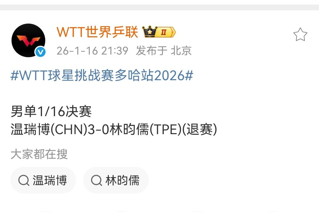 WTT世界乒联官方消息,刚刚在多哈冠军赛获得男单冠军的林昀儒退出多哈球星挑战赛男单首轮比赛。 原定北京时间今天晚上22:00进行的男单1/16决赛林昀儒对阵温瑞博的比赛,林昀儒退出比赛,主办方提前公布国乒小将温瑞博晋级多哈球星挑战赛第二轮。 林昀儒在刚刚过去的多哈冠军赛先后战胜普卡,松岛辉空,张本智和和张禹珍,一路问鼎男单冠军,没有想到赛场上看起来势头正盛的林昀儒混双搭档郑怡静2:3不敌国乒混双小将陈俊菘、覃予萱组合,更没想到男单首轮林昀儒就退出比赛,希望林昀儒身体健康,下个赛场见。