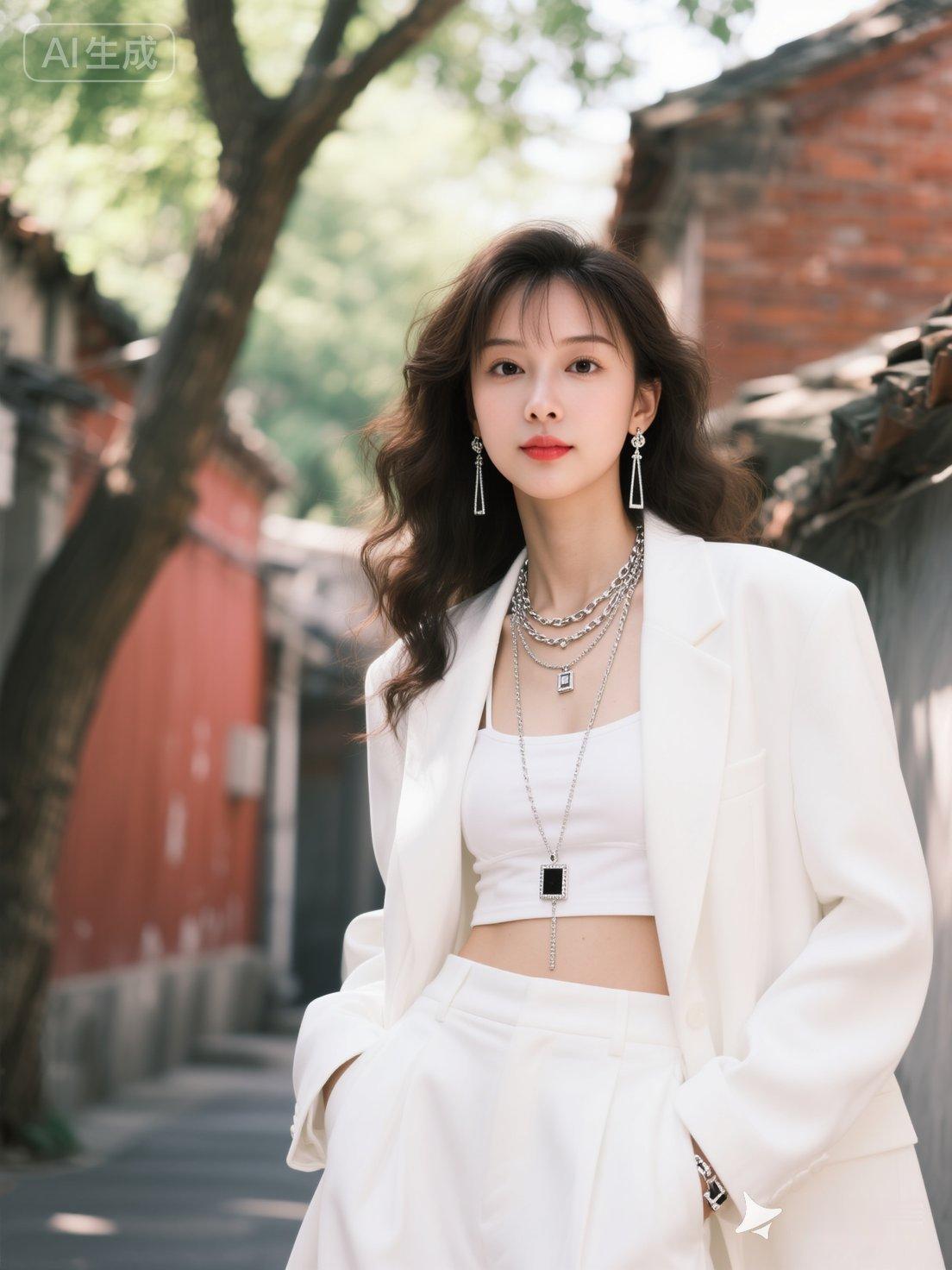 一位绝色年轻美女闲坐于秋季公园长椅,身着全白套装,外搭白色上衣,内配紧身微喇裤,