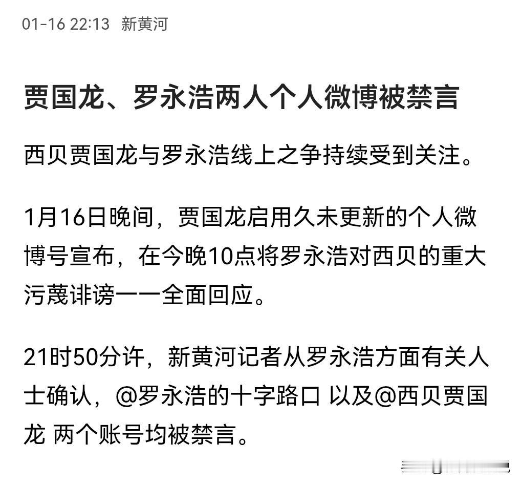 这下可真是敲响了警钟啊!网络不是法外之地,本来在1月16日晚上10点。 西贝贾国龙本来想回应一项关于近期的争议。 但是新浪微博不给他机会,毕竟这样的行为也是不被新浪的条款所支持的。 所以说还是要遵守平台的规则,账号才能走得更长远。 1月16日消息,贾国龙、罗永浩两人个人微博被禁言。 要是不被禁言的话,那必定会又要掀起一股无法想象的热度。 支持平台的决定。 也让我们清楚地知道网络不是搞骂战的地方。