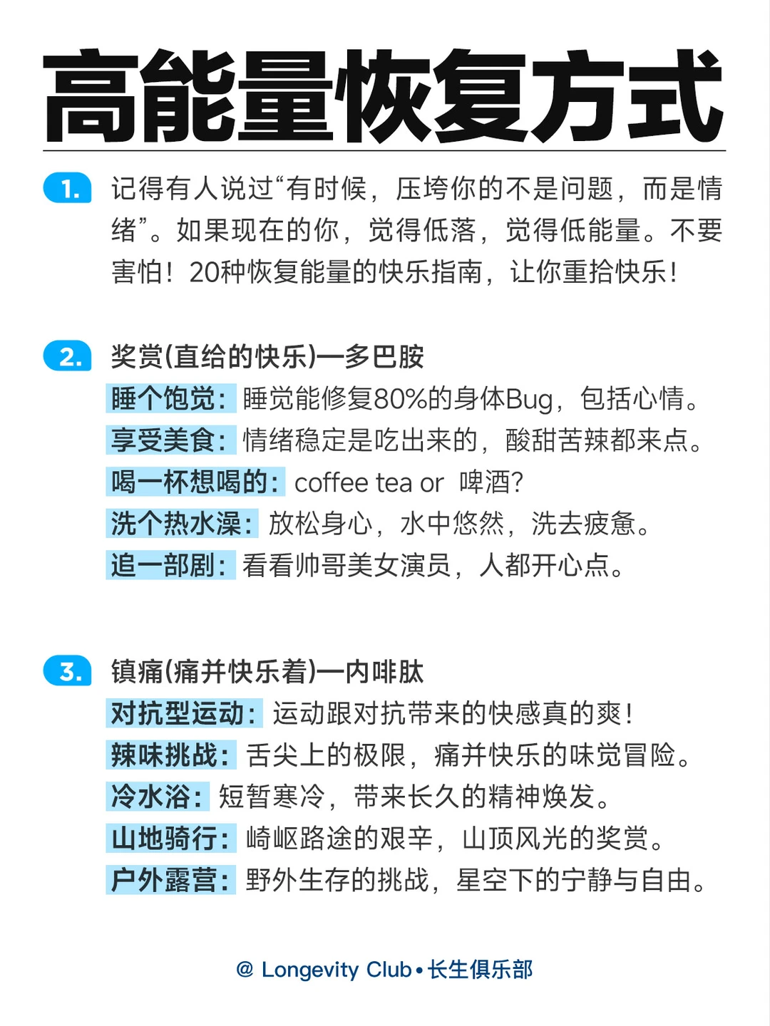 记得有人说过“有时候,压垮你的不是问题,而是情绪” 如果现在的你,觉得低落,觉得低能量 其实陷进烦恼里不要紧,重要的是可以走出来 生活的快乐事还是有很多的 不要害怕! 20种恢复能量的快乐指南 让你重拾快乐! 希望你可以快…….乐起来