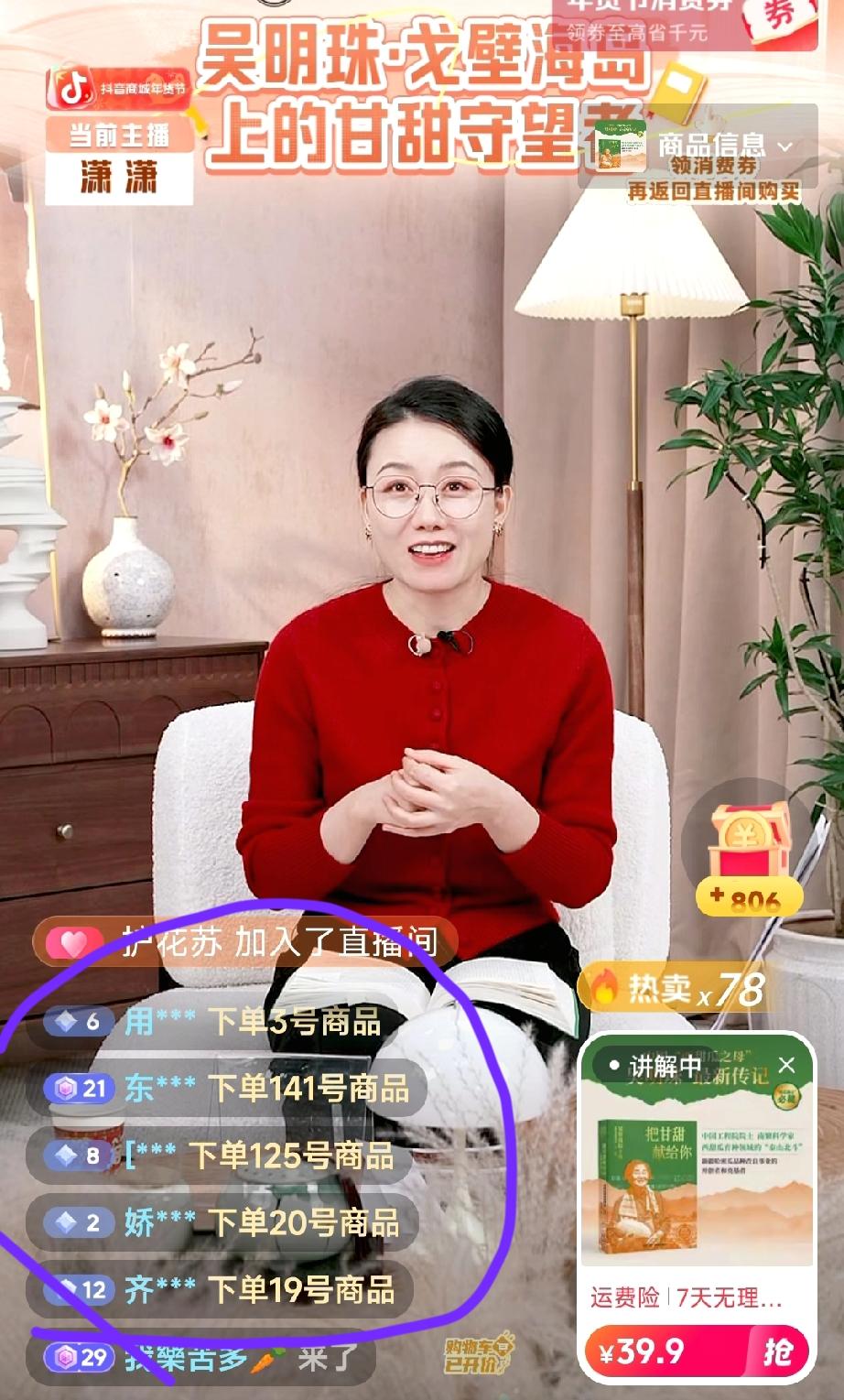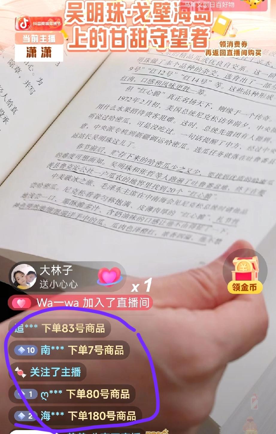 这种场面在别的直播间估计不可能见到吧。今天晚上在兰知春序直播间,潇潇正在讲着书,娓娓道来。评论区没有朋友说话,都在默默的下单,而且是从几号到十几号到几十号到100多号商品都有,看起来很有意思,都不带重样的。 可见这会大伙都忙好了,有空在小黄车里扒拉自己所需要的物品了。这些让大家都看到了与辉同行和兰之知春序就是大家的线上超市。家里缺什么的时候就可以来他们的橱窗或者小黄车里面扒拉。不管他们有没有在直播,也不管主播在讲的什么产品,都不耽误大家自行购物。同时与辉同行和兰知春序也给大家带来了很多方便,解除了购物烦恼。 董宇辉 与辉同行