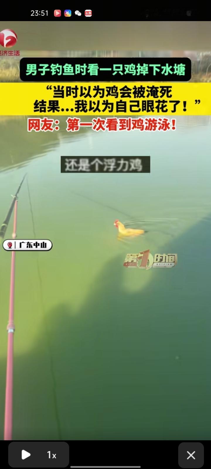 1月10日,广东中山。网友发视频表示,自己钓鱼看见一只鸡掉进水塘,以为鸡会被淹死,结果以为自己眼花了,它游了三四分钟就自己上来了。评论区有网友称,第一次看到鸡游泳。