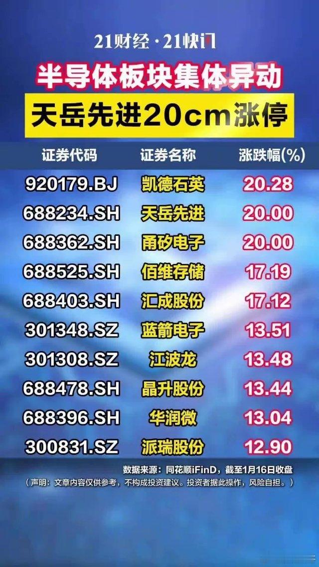 A股半导体板块集体异动,天岳先进20cm涨停1月16日,三大指数早盘冲高后震荡回落,沪指跌0.26%报4101.91点。板块上,半导体概念股狂飙,凯德石英涨超20%领涨,天岳先进、甬矽电子20cm涨停,蓝箭电子、江波龙等多只概念股涨超10%跟涨。