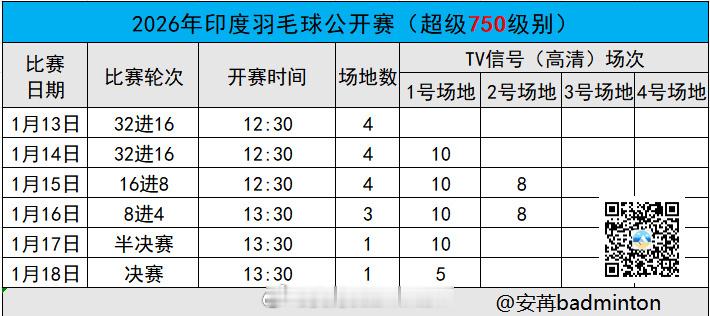 2026年印度羽毛球公开赛【半决赛】赛程(图1)【8进4】完整赛果(图2)开赛时间(图3)🟣一号场地(13:30🕜开赛)1 福岛由纪/松本麻佑🇯🇵 vs 陈康乐/蒂娜🇲🇾(3-5)2 陈雨菲🇨🇳 vs 王祉怡🇨🇳(10-1)3 刘圣书/谭宁🇨🇳 vs 白荷娜/李绍希🇰🇷(7-6)4 安洗莹🇰🇷 vs 因达农🇹🇭(12-1)5 冯彦哲/黄东萍🇨🇳 vs 德差波/苏皮萨拉🇹🇭(3-2)6 乔纳坦🇮🇩 vs 骆建佑🇸🇬(8-0)7 绿川大辉/山下恭平🇯🇵 vs 谢定峰/苏伟译🇲🇾(0-1)8 马蒂亚斯/博尔🇩🇰 vs 蒋振邦/魏雅欣🇨🇳(2-4)9 赖浩俊🇨🇦 vs 林俊易ᴛᴘᴇ10 姜珉赫/奇东柱🇰🇷 vs 梁伟铿/王昶🇨🇳(1-1)🟣直播地址:中国羽毛球协会公众号&视频号/优酷等🟣实时比分:网页链接🌟羽球🏸观赛聊天群:羽你一起来看球🌟综合体育🏟️聊天群:综合体育畅聊群🌟欢迎你的加入,一起开心^O^看球,聊球! 新年快乐羽毛球