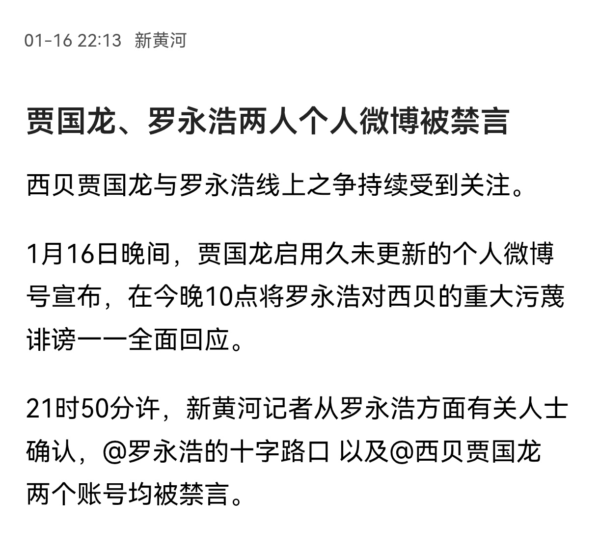 媒体报道:贾国龙罗永浩被禁言...等了一晚上想吃个瓜,结果迟迟没等到进展,还以为他俩私下去喝酒了,结果竟然是被禁言了...不过,说实在的,两人消停会儿也好,要知道前一波之后西贝的运营状况就不佳,如今如此也算是救了西贝...顺着网线摸了一把来去之间,原来微博CEO王高飞已经回应了:“以后想论战,应该还是需要通过媒体采访的方式来进行~~” 罗永浩朋友圈最新发声